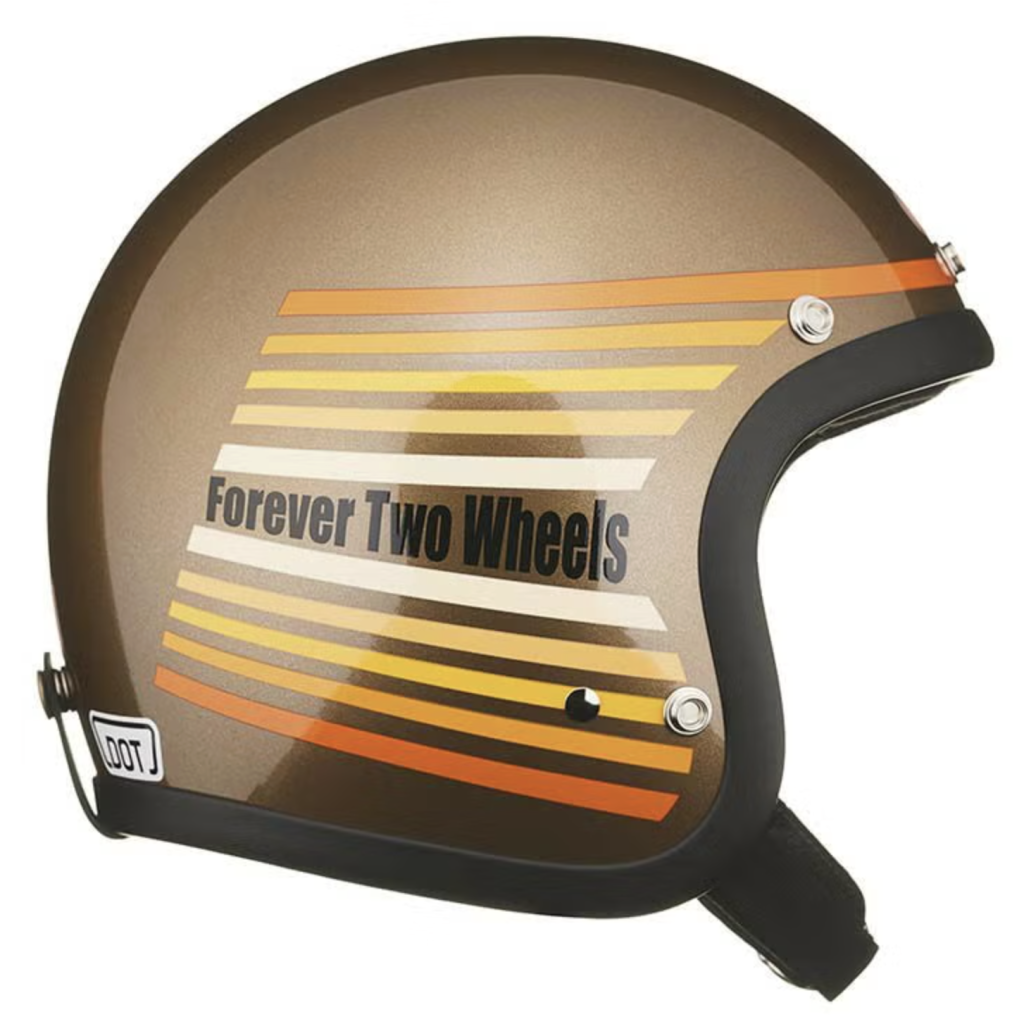 レインボーはサイドに細い線でグラデーション気味のラインが入っており、中央にはアメリカのバイカースラングでよく使われる「Forever Two Wheels」という文字が入れ込まれています。