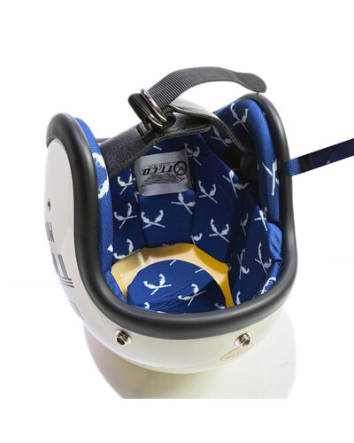 内装に使われている生地にはroargunsのクロスガンをモチーフにしたアイコンが入っており、ヘルメットを脱いだ時に見える仕様となっています。