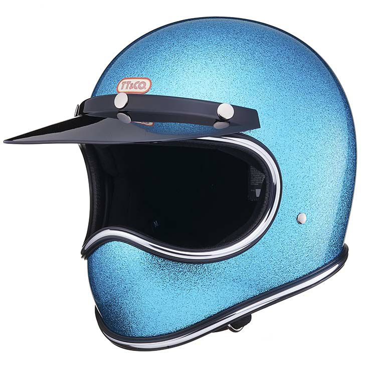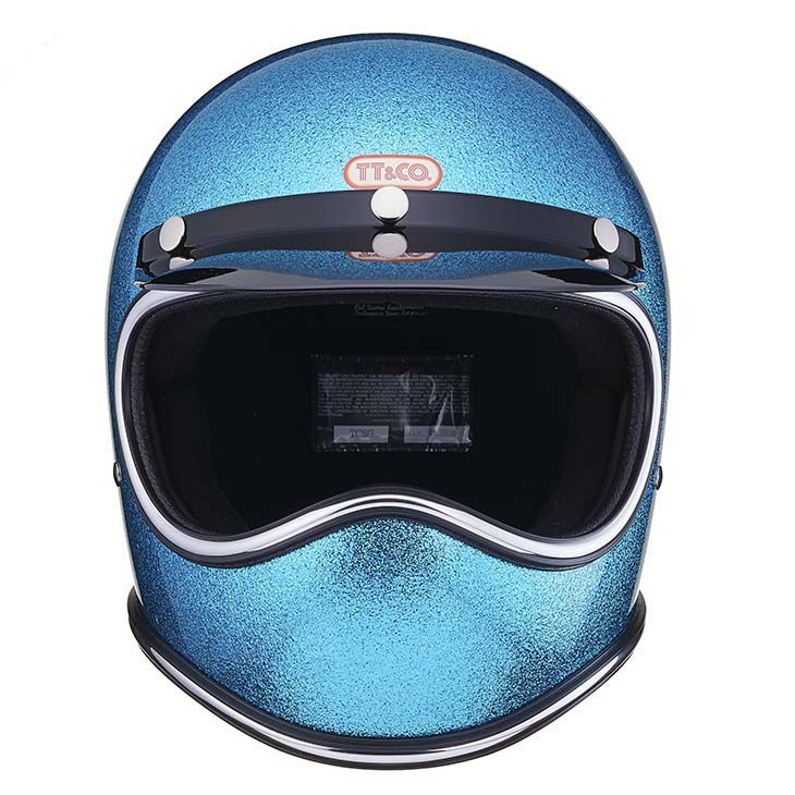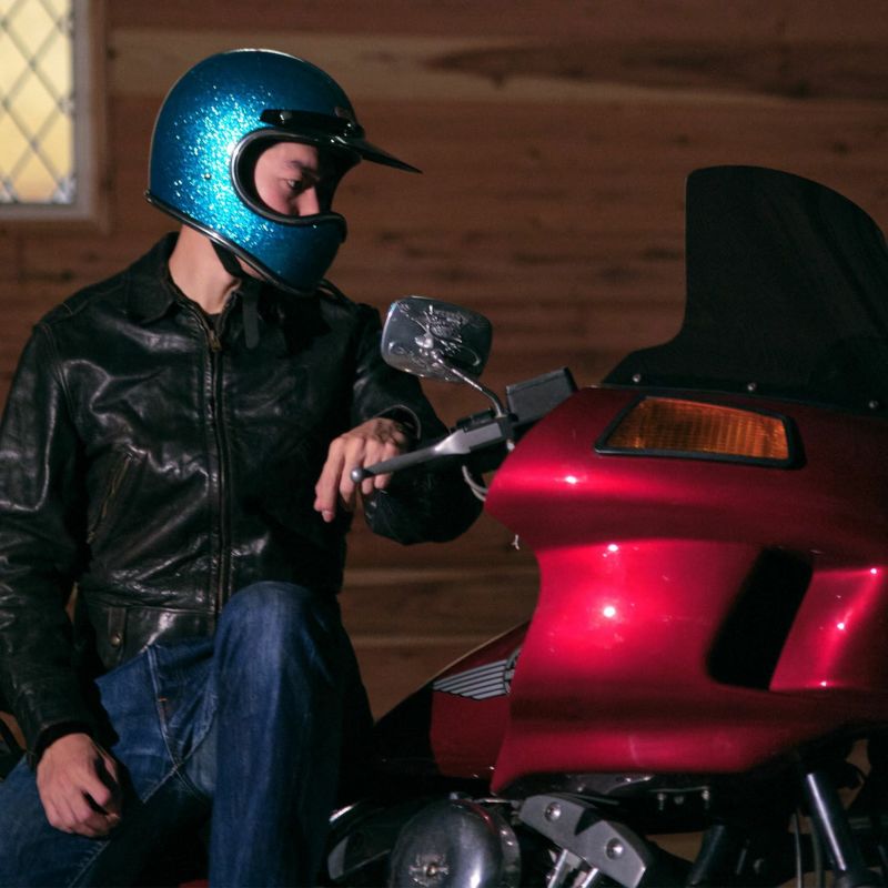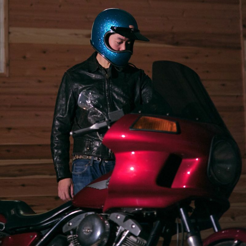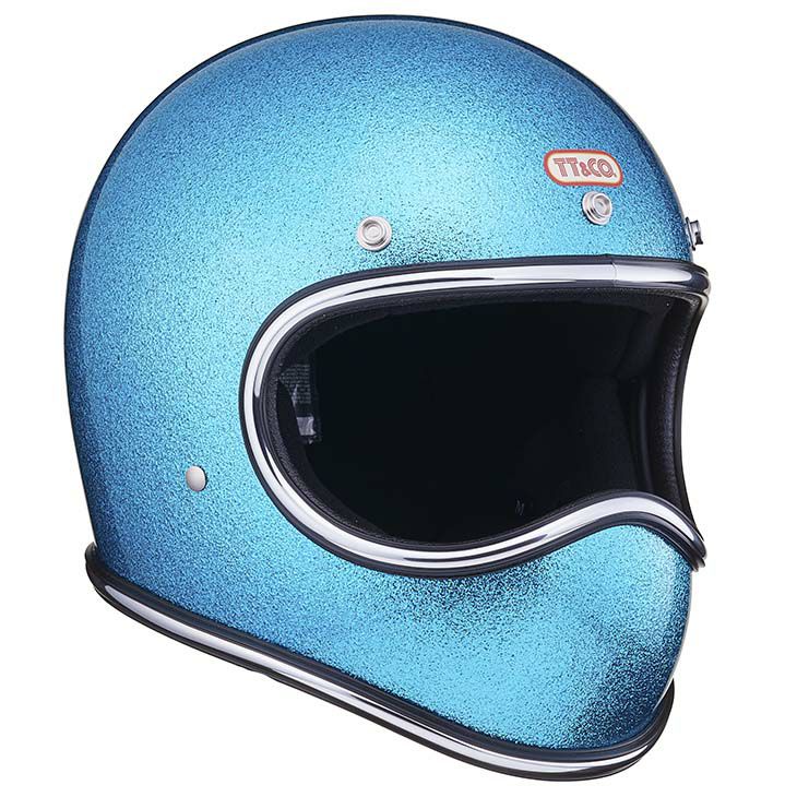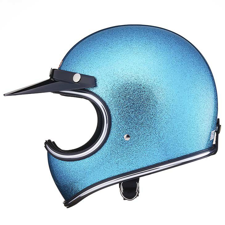 【TOECUTTER SG/DOT GINGIRA 70's LIGHT BLUE】 (トゥーカッター SG/DOT ギンギラセブンティーズ ライトブルー) 70年代のヴィンテージヘルメットをイメージしたフレーク(ラメ)ヘルメット。 大粒のフレークを下地が見えなくなるまで吹き付けています。 クロームラバートリム仕様。 ヴィンテージヘルメットに使われていた極厚タイプです。 ビンテージスタイルのフルフェイスヘルメット。 3D設計のシェルは乗車用規格で最小サイズのスモールフルフェイスヘルメットです。 日本人の頭に合わせた内装と、重量1.4キログラム以下という軽量化を行い、快適なかぶり心地を実現。 ・標準サイズは、58~59cm (M/Lサイズ、FREEサイズ、相当) ・頭囲53~54cmの方は、 別売りの XSサイズ内装セット ・頭囲55~56cmの方は、 別売りの Sサイズ内装セット ・頭囲56~57cmの方は、 別売りの チークパッドSサイズ、サイズ調整スポンジ ・頬回りがきつい方は、 別売りの チークパッド XLサイズ をお求めください。 ※帽体はSG規格とDOT規格に適合しております。 専用バイザーを付属し、後頭部にはゴーグル留めを装備しました。 画像の色や質感はできる限り実物に近くなるように努めておりますが お使いの環境(モニター、携帯の機種等)により異なる場合がございます。 蛍光灯,太陽光,電球などの環境下によっては色味の見え方が異なる場合がございます。 蛍光灯など白色の光の場合には、色味が明るくはっきりとした色になり、 暖色系電球などの光の場合には、暗く色が落ち着き、色味が濃く見えます。 トゥーカッター専用ゴーグルはラバーモール用に設計しております。 この仕様で使用される場合は隙間やズレなどフィット感に違和感を感じる場合があります。 予めご了承ください。 <トゥーカッター 専用ゴーグル同時購入限定価格> トゥーカッター(革物、グラフィック含む)とトゥーカッター 専用ゴーグル同時購入の場合のみ、9,702円(税込)で販売致します。 このまま13,860円(税込)で購入頂き、受注確認後に弊社にて価格修正を行います。 ・トゥーカッター専用ゴーグルの販売ページ ・TTゴーグルモデルAの販売ページ ・仕様変更専用ダブルストラップの販売ページ ・バブルシールドの販売ページ ・フリップアップシールドの販売ページ ・チークパッドの販売ページ ・サイズ調整スポンジの販売ページ ・Sサイズ内装セットの販売ページ ・XSサイズ内装セットの販売ページ