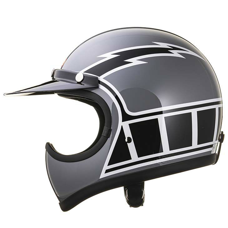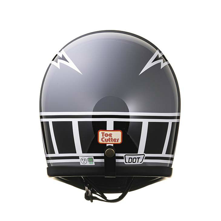 【TOECUTTER SG/DOT STROBEFLASH GRAY】 (トゥーカッター SG/DOT ストロボフラッシュ グレイ) トラディショナルなライトニングデザインのグラフィックモデルです。 ビンテージスタイルのフルフェイスヘルメット。 3D設計のシェルは乗車用規格で最小サイズのスモールフルフェイスヘルメットです。 日本人の頭に合わせた内装と、重量1.2キログラムという軽量化を行い、快適なかぶり心地を実現。 ・標準サイズは、58~59cm (M/Lサイズ、FREEサイズ、相当) ・頭囲53~54cmの方は、 別売りの XSサイズ内装セット ・頭囲55~56cmの方は、 別売りの Sサイズ内装セット ・頭囲56~57cmの方は、 別売りの チークパッドSサイズ、サイズ調整スポンジ ・頬回りがきつい方は、 別売りの チークパッド XLサイズ をお求めください。 ※帽体はSG規格とDOT規格に適合しております。 専用バイザーを付属し、後頭部にはゴーグル留めを装備しました。 画像の色や質感はできる限り実物に近くなるように努めておりますが お使いの環境(モニター、携帯の機種等)により異なる場合がございます。 <トゥーカッター 専用ゴーグル同時購入限定価格> トゥーカッター(革物、グラフィック含む)とトゥーカッター 専用ゴーグル同時購入の場合のみ、9,702円(税込)で販売致します。 このまま13,860円(税込)で購入頂き、受注確認後に弊社にて価格修正を行います。 ・トゥーカッター専用ゴーグルの販売ページ ・TTゴーグルモデルAの販売ページ ・仕様変更専用ダブルストラップの販売ページ ・バブルシールドの販売ページ ・フリップアップシールドの販売ページ ・チークパッドの販売ページ ・サイズ調整スポンジの販売ページ ・Sサイズ内装セットの販売ページ ・XSサイズ内装セットの販売ページ