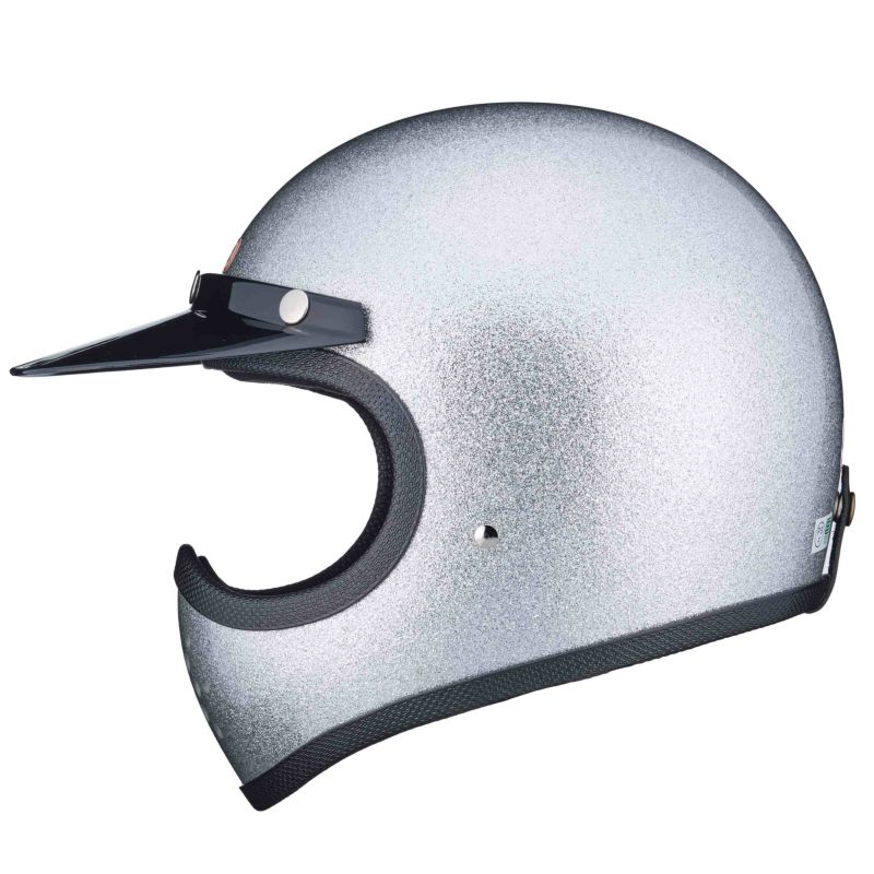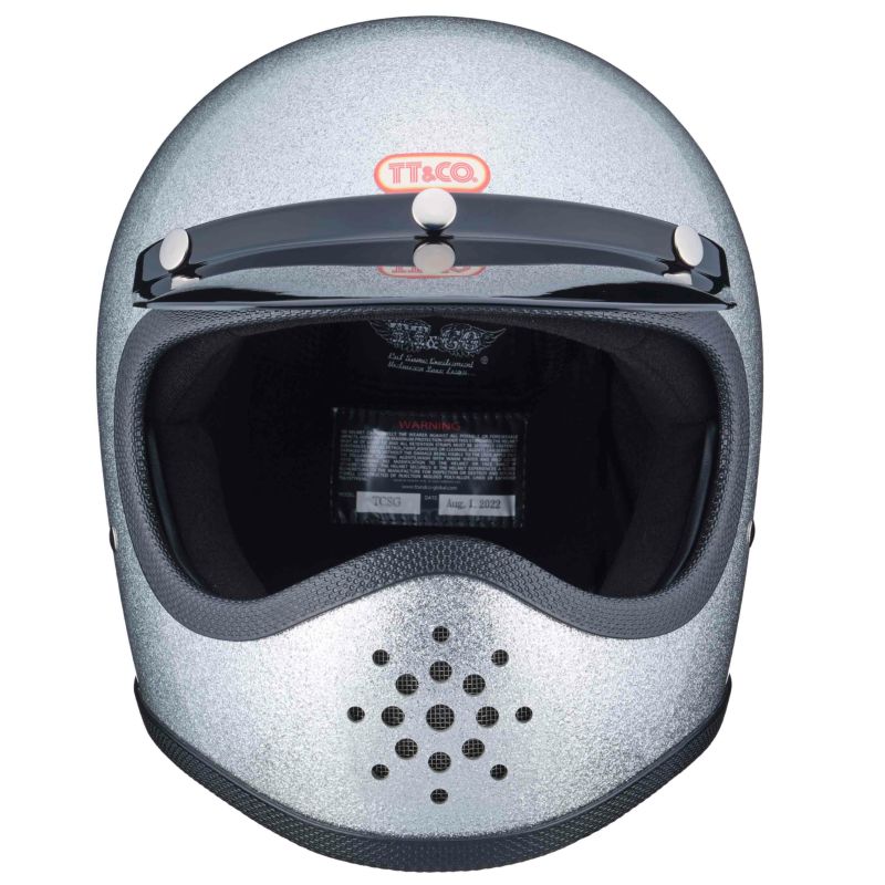【TOECUTTER SG/DOT GINGIRA 70's CUSTOM1 SILVER】 (トゥーカッター SG/DOT ギンギラセブンティーズ カスタム1 シルバー) 70年代のヴィンテージヘルメットをイメージしたフレーク(ラメ)ヘルメット。 大粒のフレークを下地が見えなくなるまで吹き付けています。 マウス部分にドリルド加工が施されています。 ビンテージスタイルのフルフェイスヘルメット。 3D設計のシェルは乗車用規格で最小サイズのスモールフルフェイスヘルメットです。 日本人の頭に合わせた内装と、重量1.4キログラム以下という軽量化を行い、快適なかぶり心地を実現。 ・標準サイズは、58~59cm (M/Lサイズ、FREEサイズ、相当) ・頭囲53~54cmの方は、 別売りの XSサイズ内装セット ・頭囲55~56cmの方は、 別売りの Sサイズ内装セット ・頭囲56~57cmの方は、 別売りの チークパッドSサイズ、サイズ調整スポンジ ・頬回りがきつい方は、 別売りの チークパッド XLサイズ をお求めください。 ※帽体はSG規格とDOT規格に適合しております。 専用バイザーを付属し、後頭部にはゴーグル留めを装備しました。 画像の色や質感はできる限り実物に近くなるように努めておりますが お使いの環境(モニター、携帯の機種等)により異なる場合がございます。 蛍光灯,太陽光,電球などの環境下によっては色味の見え方が異なる場合がございます。 蛍光灯など白色の光の場合には、色味が明るくはっきりとした色になり、 暖色系電球などの光の場合には、暗く色が落ち着き、色味が濃く見えます。 トゥーカッター専用ゴーグルはラバーモール用に設計しております。 この仕様で使用される場合は隙間やズレなどフィット感に違和感を感じる場合があります。 予めご了承ください。 <トゥーカッター 専用ゴーグル同時購入限定価格> トゥーカッター(革物、グラフィック含む)とトゥーカッター 専用ゴーグル同時購入の場合のみ、9,702円(税込)で販売致します。 このまま13,860円(税込)で購入頂き、受注確認後に弊社にて価格修正を行います。 ・トゥーカッター専用ゴーグルの販売ページ ・TTゴーグルモデルAの販売ページ ・仕様変更専用ダブルストラップの販売ページ ・バブルシールドの販売ページ ・フリップアップシールドの販売ページ ・チークパッドの販売ページ ・サイズ調整スポンジの販売ページ ・Sサイズ内装セットの販売ページ ・XSサイズ内装セットの販売ページ