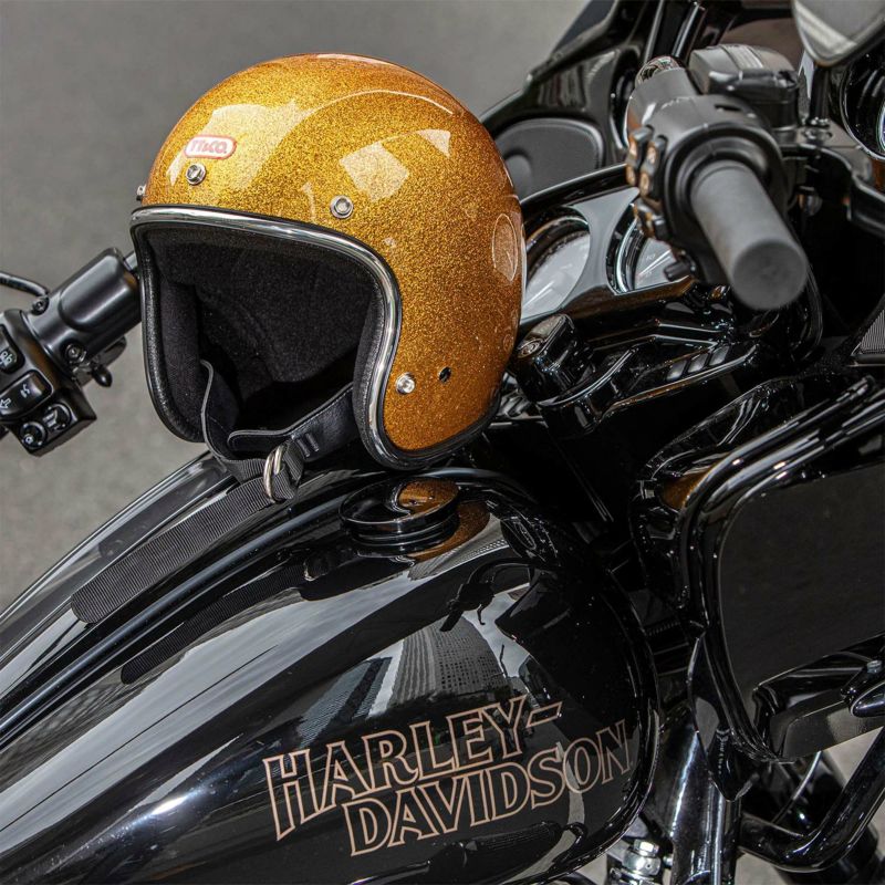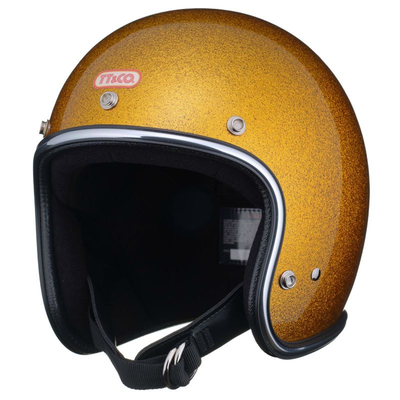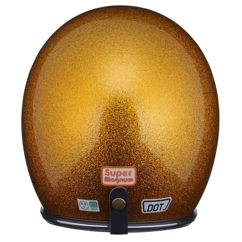 【SUPER MAGNUM GINGIRA 70's CHROME TRIM ORANGE】 (スーパーマグナム ギンギラセブンティーズ クローム トリム オレンジ) クロームラバートリム仕様。 ヴィンテージヘルメットに使われていた極厚タイプです。 70年代のヴィンテージヘルメットをイメージしたフレーク(ラメ)ヘルメット。 大粒のフレークを下地が見えなくなるまで吹き付けています。 ビンテージヘルメットの名作『500-TX』を参考に、『より目深にかぶれて、より小さく見えるシェル』を開発しました。 日本人体型にベストマッチさせた『たまご型』のスリムシェイプが最大の特徴。 クラシカルな雰囲気と、バランスの良い一体感が得られます。 ・標準サイズは、57~58cm (M/Lサイズ、FREEサイズ、相当) ・頭囲55~56cmの方は、 別売りの Sサイズ内装セット ・頭囲53~54cmの方は、 別売りの XSサイズ内装セット をお求めください。 ※帽体はSG規格とDOT規格に適合しております。 あご紐ベルトは、Dリング固定式です。 後頭部にはゴーグルストッパーも装備しております。 お気に入りのサングラスやバイザー、汎用ゴーグルや各シールドなど幅広いスタイルを楽しめます。 画像の色や質感はできる限り実物に近くなるように努めておりますが お使いの環境(モニター、携帯の機種等)により異なる場合がございます。 ・TTゴーグルモデルAの販売ページ ・バブルシールドの販売ページ ・フリップアップシールドの販売ページ ・サイズ調整スポンジの販売ページ ・Sサイズ内装セットの販売ページ ・XSサイズ内装セットの販売ページ