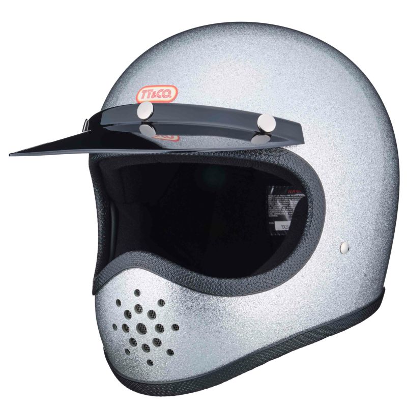 【TOECUTTER SG/DOT GINGIRA 70's CUSTOM1 SILVER】 (トゥーカッター SG/DOT ギンギラセブンティーズ カスタム1 シルバー) 70年代のヴィンテージヘルメットをイメージしたフレーク(ラメ)ヘルメット。 大粒のフレークを下地が見えなくなるまで吹き付けています。 マウス部分にドリルド加工が施されています。 ビンテージスタイルのフルフェイスヘルメット。 3D設計のシェルは乗車用規格で最小サイズのスモールフルフェイスヘルメットです。 日本人の頭に合わせた内装と、重量1.4キログラム以下という軽量化を行い、快適なかぶり心地を実現。 ・標準サイズは、58~59cm (M/Lサイズ、FREEサイズ、相当) ・頭囲53~54cmの方は、 別売りの XSサイズ内装セット ・頭囲55~56cmの方は、 別売りの Sサイズ内装セット ・頭囲56~57cmの方は、 別売りの チークパッドSサイズ、サイズ調整スポンジ ・頬回りがきつい方は、 別売りの チークパッド XLサイズ をお求めください。 ※帽体はSG規格とDOT規格に適合しております。 専用バイザーを付属し、後頭部にはゴーグル留めを装備しました。 画像の色や質感はできる限り実物に近くなるように努めておりますが お使いの環境(モニター、携帯の機種等)により異なる場合がございます。 蛍光灯,太陽光,電球などの環境下によっては色味の見え方が異なる場合がございます。 蛍光灯など白色の光の場合には、色味が明るくはっきりとした色になり、 暖色系電球などの光の場合には、暗く色が落ち着き、色味が濃く見えます。 トゥーカッター専用ゴーグルはラバーモール用に設計しております。 この仕様で使用される場合は隙間やズレなどフィット感に違和感を感じる場合があります。 予めご了承ください。 <トゥーカッター 専用ゴーグル同時購入限定価格> トゥーカッター(革物、グラフィック含む)とトゥーカッター 専用ゴーグル同時購入の場合のみ、9,702円(税込)で販売致します。 このまま13,860円(税込)で購入頂き、受注確認後に弊社にて価格修正を行います。 ・トゥーカッター専用ゴーグルの販売ページ ・TTゴーグルモデルAの販売ページ ・仕様変更専用ダブルストラップの販売ページ ・バブルシールドの販売ページ ・フリップアップシールドの販売ページ ・チークパッドの販売ページ ・サイズ調整スポンジの販売ページ ・Sサイズ内装セットの販売ページ ・XSサイズ内装セットの販売ページ