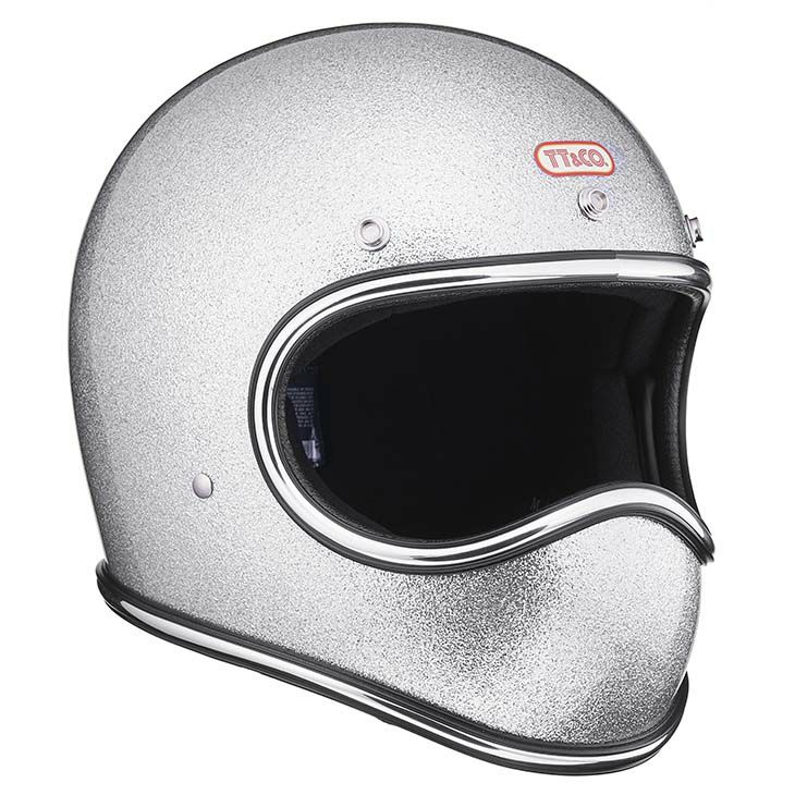 【TOECUTTER SG/DOT GINGIRA 70's SILVER】 (トゥーカッター SG/DOT ギンギラセブンティーズ シルバー) 70年代のヴィンテージヘルメットをイメージしたフレーク(ラメ)ヘルメット。 大粒のフレークを下地が見えなくなるまで吹き付けています。 クロームラバートリム仕様。 ヴィンテージヘルメットに使われていた極厚タイプです。 ビンテージスタイルのフルフェイスヘルメット。 3D設計のシェルは乗車用規格で最小サイズのスモールフルフェイスヘルメットです。 日本人の頭に合わせた内装と、重量1.4キログラム以下という軽量化を行い、快適なかぶり心地を実現。 ・標準サイズは、58~59cm (M/Lサイズ、FREEサイズ、相当) ・頭囲53~54cmの方は、 別売りの XSサイズ内装セット ・頭囲55~56cmの方は、 別売りの Sサイズ内装セット ・頭囲56~57cmの方は、 別売りの チークパッドSサイズ、サイズ調整スポンジ ・頬回りがきつい方は、 別売りの チークパッド XLサイズ をお求めください。 ※帽体はSG規格とDOT規格に適合しております。 専用バイザーを付属し、後頭部にはゴーグル留めを装備しました。 画像の色や質感はできる限り実物に近くなるように努めておりますが お使いの環境(モニター、携帯の機種等)により異なる場合がございます。 トゥーカッター専用ゴーグルはラバーモール用に設計しております。 この仕様で使用される場合は隙間やズレなどフィット感に違和感を感じる場合があります。 予めご了承ください。 <トゥーカッター 専用ゴーグル同時購入限定価格> トゥーカッター(革物、グラフィック含む)とトゥーカッター 専用ゴーグル同時購入の場合のみ、9,702円(税込)で販売致します。 このまま13,860円(税込)で購入頂き、受注確認後に弊社にて価格修正を行います。 ・トゥーカッター専用ゴーグルの販売ページ ・TTゴーグルモデルAの販売ページ ・仕様変更専用ダブルストラップの販売ページ ・バブルシールドの販売ページ ・フリップアップシールドの販売ページ ・チークパッドの販売ページ ・サイズ調整スポンジの販売ページ ・Sサイズ内装セットの販売ページ ・XSサイズ内装セットの販売ページ