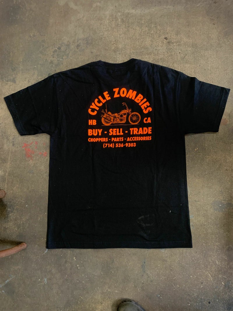 "Everyday" T-Shirt 100%コットンのしっかりとした生地に、スタンダードフィットのタフなボディ。 着るほどに馴染み、ヴィンテージの風合いが楽しめるTシャツです。 背面には、ヴィンテージチョッパーのイラストを中心に構成された、グラフィックを大胆に配置。 全体はビビッドなオレンジプリントで構成され、黒ボディに映える無骨な仕上がり。 Cycle Zombiesらしい存在感ある一枚。 サイズはS~XLまで展開。 一枚でも重ね着でも、季節を問わず活躍する万能なアイテムです。 <<サイズ>> Sサイズ 身丈67cm 身幅47cm 袖丈35cm Mサイズ 身丈72cm 身幅50cm 袖丈39cm Lサイズ 身丈78cm 身幅56cm 袖丈43cm XLサイズ 身丈81cm 身幅61cm 袖丈48cm 多少の誤差はご了承ください。 画像の色や質感はできる限り実物に近くなるように努めておりますが お使いの環境(モニター、携帯の機種等)により異なる場合がございます。
