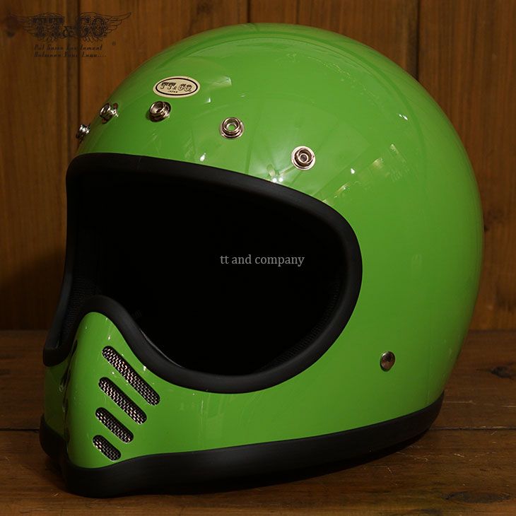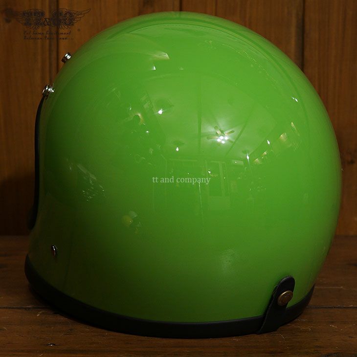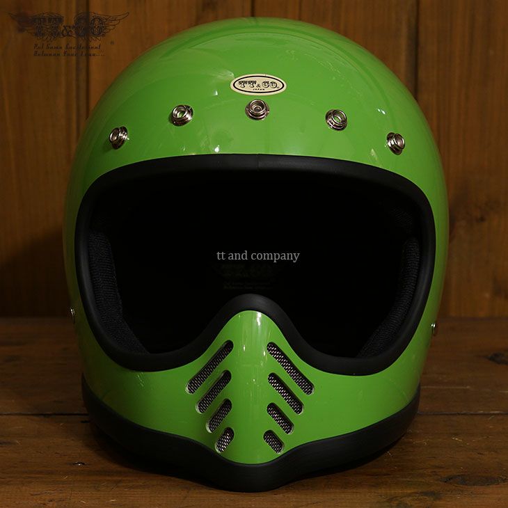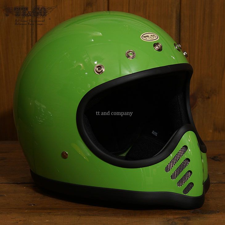 ★☆★☆★☆★☆★☆★☆★☆★☆★☆★☆★☆ 完売致しました。 ★☆★☆★☆★☆★☆★☆★☆★☆★☆★☆★☆ VMX-01 GREEN (VMX-01 グリーン) 1970年代の BELL MOTO3 をイメージした、 ヴィンテージ・フルフェイススタイル。 3D設計にて試行錯誤を繰り返し完成した、小さすぎないフルフェイスです。 頭部前側に5点スナップボタン、後頭部にはゴーグル留めを装備。 (バイザーは付属しておりません。) サイズは2種類用意しました。 S/Mサイズ (55-57cm) L/XLサイズ(58-60cm) このヘルメットは、乗車用(オートバイ用)規格は取得しておりません。 装飾用ヘルメットです。 Made in Tokyo our Studio. (日本製FRP成型、自社組立)