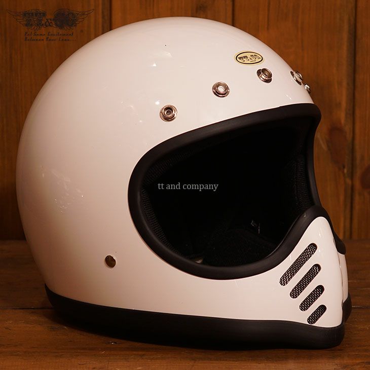 ★☆★☆★☆★☆★☆★☆★☆★☆★☆★☆★☆ 完売致しました。 ★☆★☆★☆★☆★☆★☆★☆★☆★☆★☆★☆ VMX-01 WHITE (VMX-01 ホワイト) 1970年代の BELL MOTO3 をイメージした、 ヴィンテージ・フルフェイススタイル。 3D設計にて試行錯誤を繰り返し完成した、小さすぎないフルフェイスです。 頭部前側に5点スナップボタン、後頭部にはゴーグル留めを装備。 (バイザーは付属しておりません。) サイズは2種類用意しました。 S/Mサイズ (55-57cm) L/XLサイズ(58-60cm) このヘルメットは、乗車用(オートバイ用)規格は取得しておりません。 装飾用ヘルメットです。 Made in Tokyo our Studio. (日本製FRP成型、自社組立)