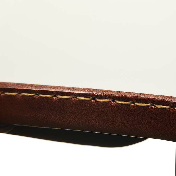 極厚の本革を、極太シニュー糸で、シェルに貫通縫付け。
