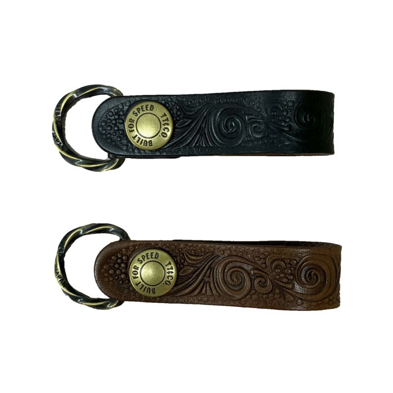 【Narrow Key Ring 07 Leaf】 (ナロー キーホルダー 07 リーフ) 厚口の牛ヌメ革を使ったキーホルダーです。 使い込まれた風合いを求めて、全体的にエイジングさせています。 ★仕上がりに個体差があります。あらかじめご了承ください。 オリジナルデザインの 唐草模様を型押し。 カービングをイメージしているので、強めに打っています。 スナップボタン、ツイストDリングも、オリジナルデザインの真鍮製です。 カラーはブラックとブラウンの2色からお選び下さい。 ベルト幅は約2cmのナロースタイル。 取付けは、45mmまでのベルトに対応しています。 注:タンニン鞣しの為、色落ち、色うつりします。 画像の色や質感はできる限り実物に近くなるように努めておりますが お使いの環境(モニター、携帯の機種等)により異なる場合がございます。 Made in Tokyo