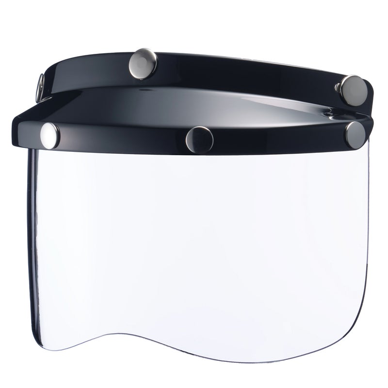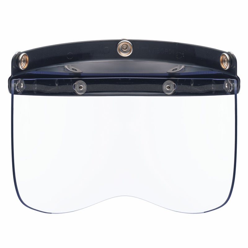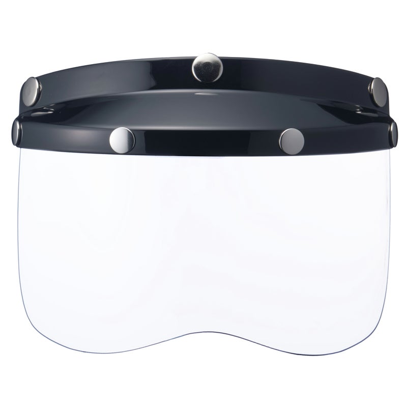 MINI VISOR BLACK WITH CLEAR SHIELD (シールド付きミニバイザー 未塗装 ブラック/クリア) ハーフタイプシールドを装着したオリジナルバイザーです。 シールドは取り外し可能です。 レザーリムショット、ヴィンテージレザートリム、ジェニュインレザートリム、シリアスVL、シリアスRS、への取り付けは不可となります。 バイザーは未塗装品の為、樹脂表面に若干のシミ、傷、汚れ、があります。 予めご了承下さい。 取付け用のスナップボタンは、安全上とてもかたい仕様になっています。 3点ともしっかりと取付け下さい。 しっかり取付け出来ていても、後方確認時など、突然の風の巻き込みにより、脱落してしまうことがあります。 ヘルメットから取り外す際は、マイナスドライバーなどを使い、接合部分をこじる様にして取り外してください。 引っ張って外すと、スナップボタンが破損することがあります。 取り外し方や、取り外し頻度により、スナップが破損することがあります。 スナップの修理は無償で行いますので、お気軽にお問い合わせ下さい。 画像の色や質感はできる限り実物に近くなるように努めておりますが お使いの環境(モニター、携帯の機種等)により異なる場合がございます。