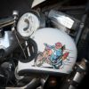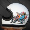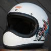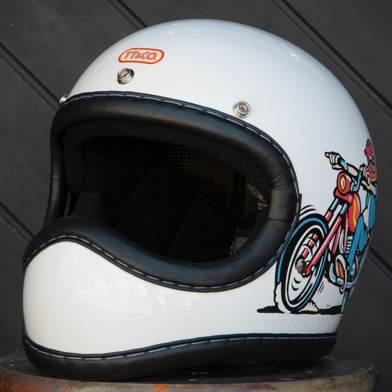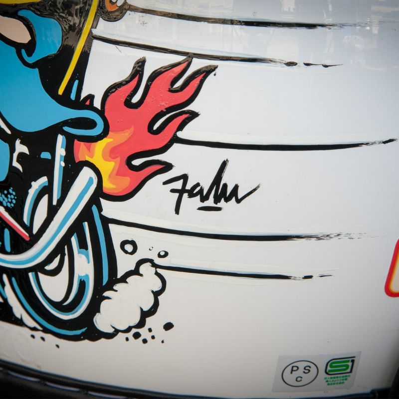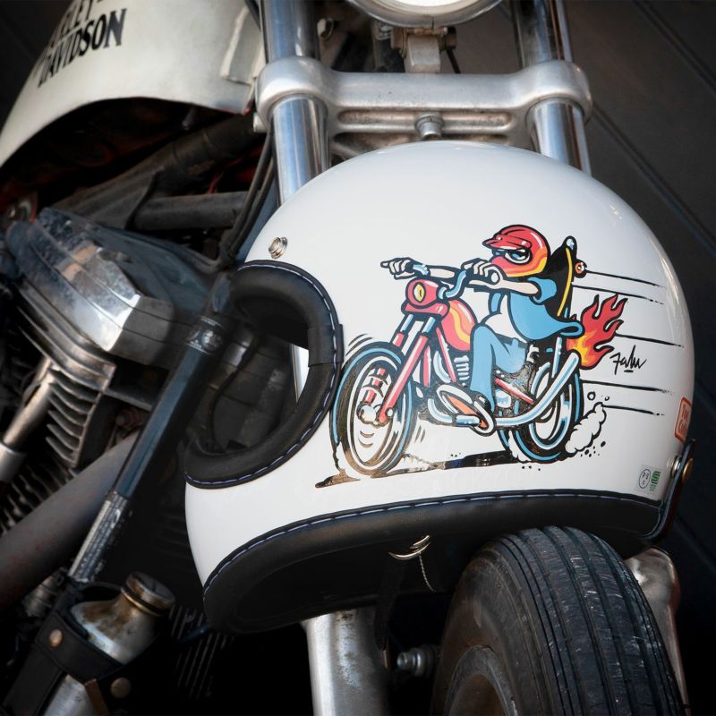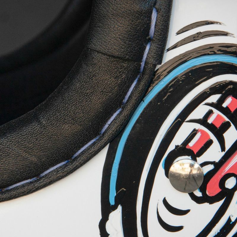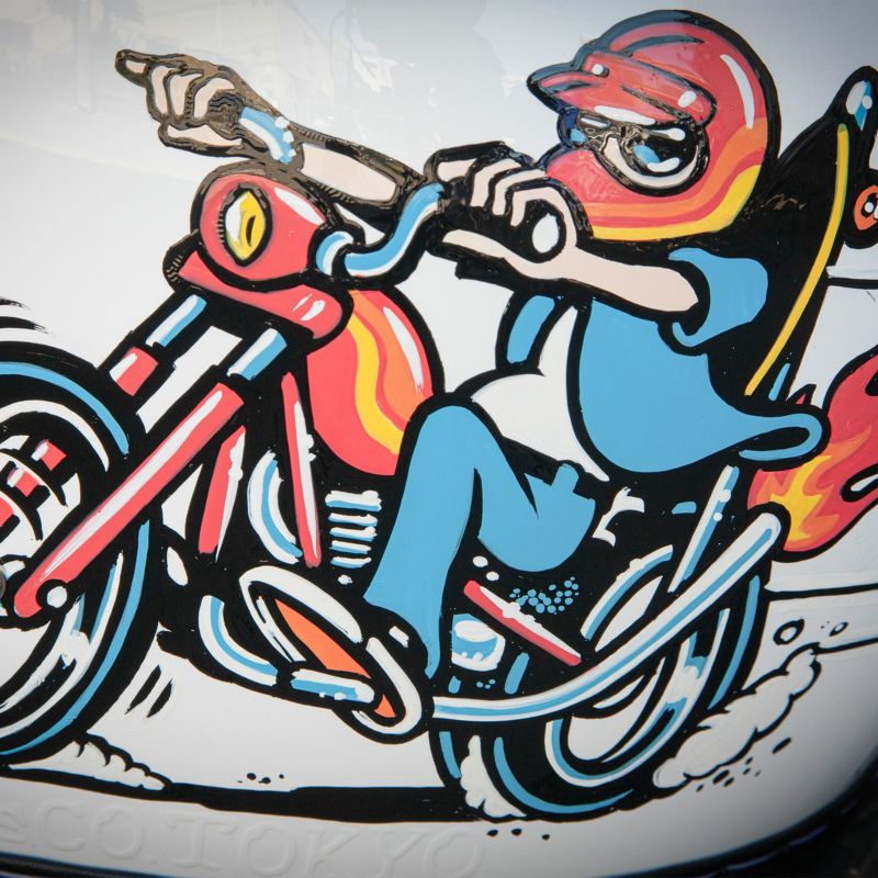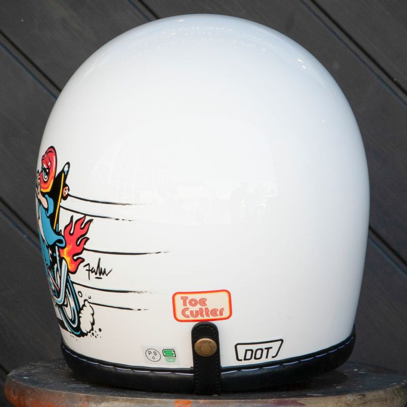 ★☆★☆★☆★☆★☆★☆★☆★☆★☆★☆★☆ 完売いたしました。 ★☆★☆★☆★☆★☆★☆★☆★☆★☆★☆★☆ TOECUTTER FALU CAROLEI ONLYONE 001 (トゥーカッター FALU CAROLEI オンリーワン (シリアルナンバー001)) FALU CAROLEI氏にハンドペイントして頂いた1個限定モデルです。 ・FALU CAROLEI ブエノスアイレス州キルメス生まれのファブリシオ・カロライ。別名ファルは、スケートボーダーでありアーティストであり、主に墨で描いた作品で知られています。 パンクロックのレコード、古いホラー漫画、スケート カルチャー、タトゥーが、彼の作品で取り上げられるテーマの一部を構成しています。 現在、彼は自分のスタジオで働いており、さまざまな衣料品ブランド、デザイン スタジオ、さらにはスケートボードやレコード ジャケットの作品を制作しています。彼はまた、壁画を作成したり、さまざまなテクニックやサポートを使って作品を制作したりしています。 1960年代のヴィンテージモデルをイメージしたレザートリム。 レザーを薄く控えめに膨らませました。 「革巻き」と親しまれ、古くはレーサー用のプロテクター部位だったと言われています。 ロウ引きされた麻糸で、シェルに貫通縫付け。 ハンドステッチで仕上げました。 銀面をリアルに割った特殊な鞣しの牛革、リアルクラックブラックを使用しております。 ヴィンテージの質感を再現すべく、経年変化を起こしやすい色入れを行いました。 色ムラがあり、色落ち、色剥がれ、銀面剥がれ、銀面キレ、しやすい仕上げです。 当社の商品コンセプトをご理解のもとお求め下さい。 サイズは、58-59cm(M/Lサイズ、FREEサイズ、相当) 帽体はSG規格(PSC)とDOT規格に適合した乗車用ヘルメットです。
