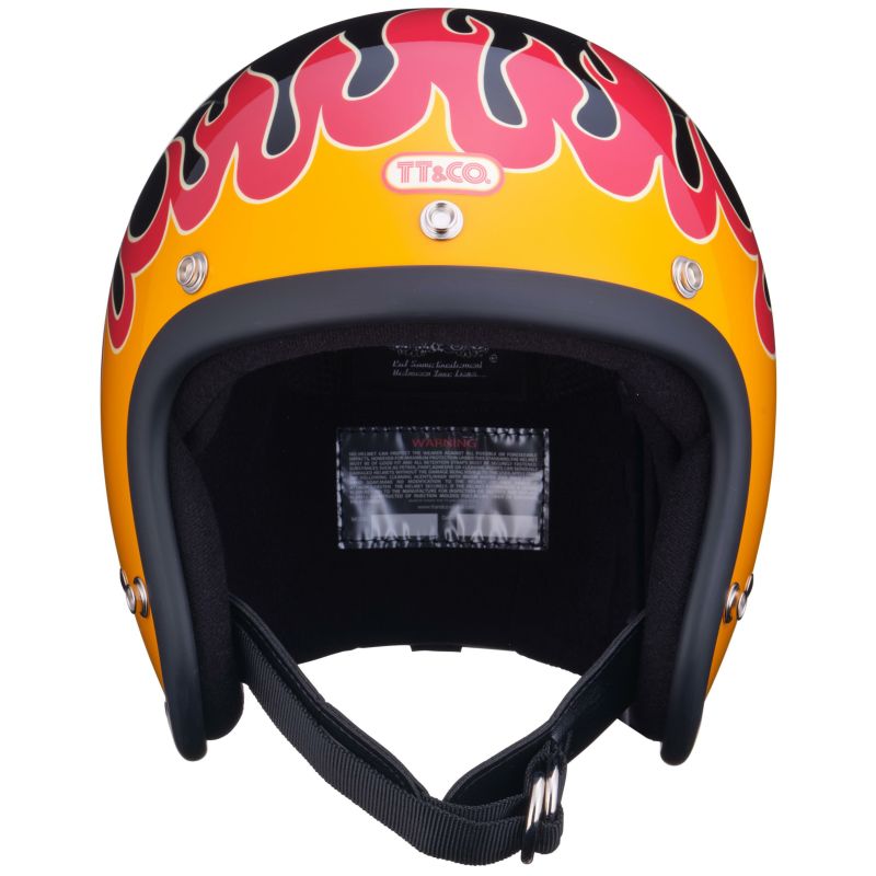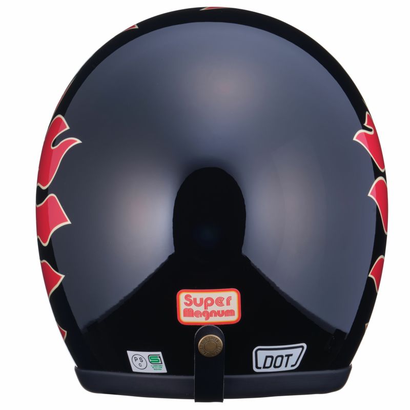 【SUPER MAGNUM VD-FIRE BLACK】 (スーパーマグナム VD-ファイヤー ブラック) ファイヤーパターンのグラフィックヘルメット。 ビンテージヘルメットの名作『500-TX』を参考に、『より目深にかぶれて、より小さく見えるシェル』を開発しました。 日本人体型にベストマッチさせた『たまご型』のスリムシェイプが最大の特徴。 クラシカルな雰囲気と、バランスの良い一体感が得られます。 ・標準サイズは、57~58cm (M/Lサイズ、FREEサイズ、相当) ・頭囲55~56cmの方は、 別売りの Sサイズ内装セット ・頭囲53~54cmの方は、 別売りの XSサイズ内装セット をお求めください。 ※帽体はSG規格とDOT規格に適合しております。 あご紐ベルトは、Dリング固定式です。 後頭部にはゴーグルストッパーも装備しております。 お気に入りのサングラスやバイザー、汎用ゴーグルや各シールドなど幅広いスタイルを楽しめます。 画像の色や質感はできる限り実物に近くなるように努めておりますが お使いの環境(モニター、携帯の機種等)により異なる場合がございます。 ・TTゴーグルモデルAの販売ページ ・バブルシールドの販売ページ ・フリップアップシールドの販売ページ ・サイズ調整スポンジの販売ページ ・Sサイズ内装セットの販売ページ ・XSサイズ内装セットの販売ページ