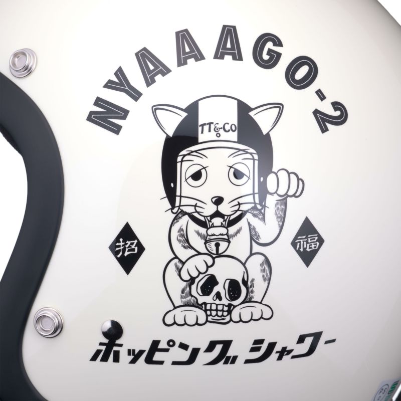 【SUPER MAGNUM NYAAGO 2】 (スーパーマグナム NYAAGO 2) "FLYING NYAAGO"に続く、第2弾モデル "NYAAGO 2" が登場。 カラーはアイボリーとブラック。 HOPPING SHOWERさんにデザインを依頼した、グラフィックヘルメット。 ビンテージヘルメットの名作『500-TX』を参考に、『より目深にかぶれて、より小さく見えるシェル』を開発しました。 日本人体型にベストマッチさせた『たまご型』のスリムシェイプが最大の特徴。 クラシカルな雰囲気と、バランスの良い一体感が得られます。 ・標準サイズは、57~58cm (M/Lサイズ、FREEサイズ、相当) ・頭囲55~56cmの方は、 別売りの Sサイズ内装セット ・頭囲53~54cmの方は、 別売りの XSサイズ内装セット をお求めください。 ※帽体はSG規格とDOT規格に適合しております。 あご紐ベルトは、Dリング固定式です。 後頭部にはゴーグルストッパーも装備しております。 お気に入りのサングラスやバイザー、汎用ゴーグルや各シールドなど幅広いスタイルを楽しめます。 DOTマークの仕様変更により、後頭部にDOTマークを埋め込んだタイプをお送りする場合がございます。 その場合は画像のように後頭部についているSuper MagnumシールとDOTシールは貼付ございません。 こちらはお選びいただく事ができませんので、何卒ご了承ください。 画像の色や質感はできる限り実物に近くなるように努めておりますが お使いの環境(モニター、携帯の機種等)により異なる場合がございます。 ・TTゴーグルモデルAの販売ページ ・バブルシールドの販売ページ ・フリップアップシールドの販売ページ ・サイズ調整スポンジの販売ページ ・Sサイズ内装セットの販売ページ ・XSサイズ内装セットの販売ページ