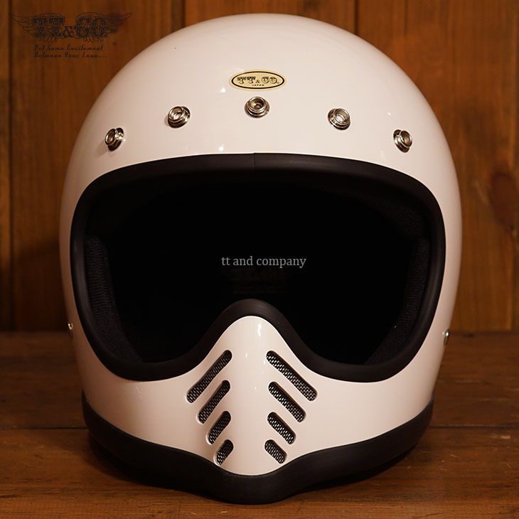 ★☆★☆★☆★☆★☆★☆★☆★☆★☆★☆★☆ 完売致しました。 ★☆★☆★☆★☆★☆★☆★☆★☆★☆★☆★☆ VMX-01 WHITE (VMX-01 ホワイト) 1970年代の BELL MOTO3 をイメージした、 ヴィンテージ・フルフェイススタイル。 3D設計にて試行錯誤を繰り返し完成した、小さすぎないフルフェイスです。 頭部前側に5点スナップボタン、後頭部にはゴーグル留めを装備。 (バイザーは付属しておりません。) サイズは2種類用意しました。 S/Mサイズ (55-57cm) L/XLサイズ(58-60cm) このヘルメットは、乗車用(オートバイ用)規格は取得しておりません。 装飾用ヘルメットです。 Made in Tokyo our Studio. (日本製FRP成型、自社組立)