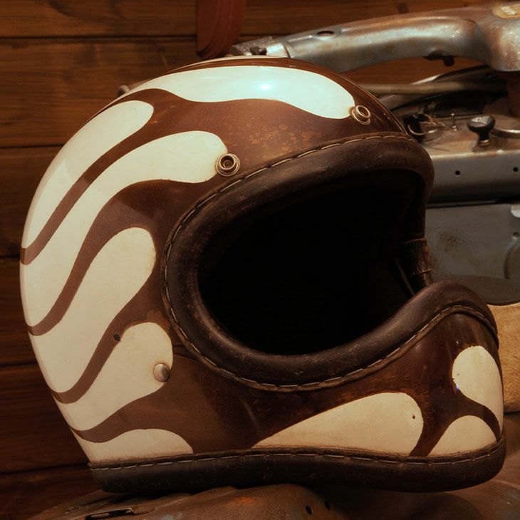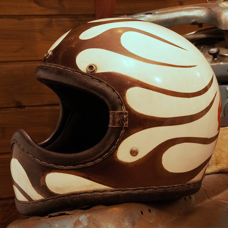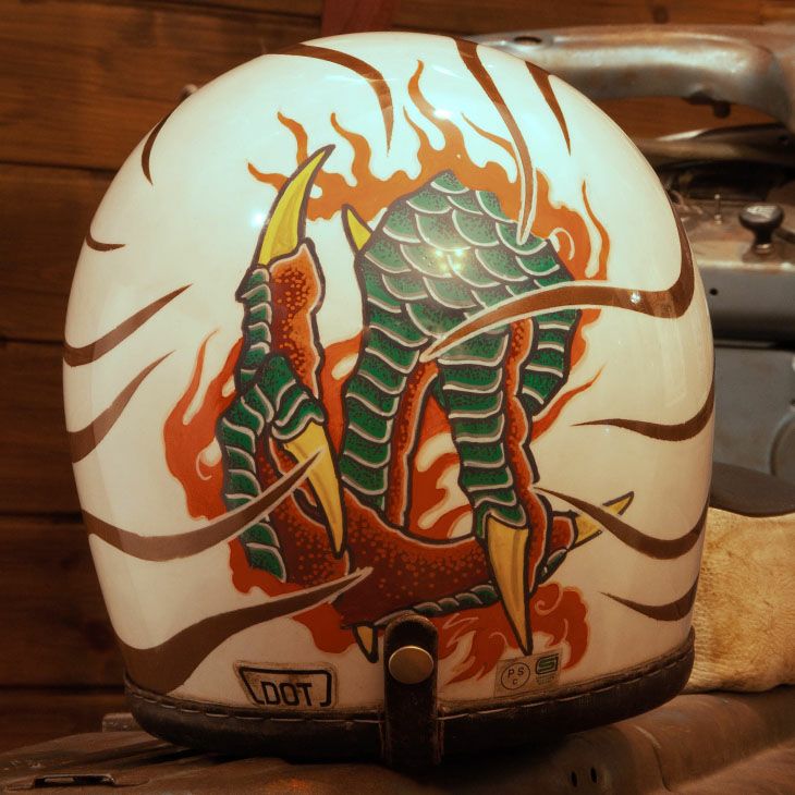 ★☆★☆★☆★☆★☆★☆★☆★☆★☆★☆★☆ 完売いたしました。 ★☆★☆★☆★☆★☆★☆★☆★☆★☆★☆★☆ TOECUTTER JIRO ONLYONE 001 (トゥーカッター JIRO オンリーワン (シリアルナンバー001)) JIRO氏にハンドペイントして頂いた1個限定モデルです。 LAで20年以上のキャリアを持つ老舗タトゥースタジオ <Onizuka Tattoo> の創業者でありタトゥーアーティスト。 “aka Lil’ Tokyo Jiro”の愛称でも呼ばれ、日本の伝統を重んじた Japanese Tattoo を得意とする。 ヴィンテージをイメージしたエイジング加工モデル。 クラック、ダメージ、汚れ、艶引け、錆、などのエイジングで仕上げました。 職人が手作業で仕上げた1点モノになりますので、それぞれ仕上げが異なります。 中古品では御座いません。 1960年代のヴィンテージモデルをイメージしたレザートリム。 レザーを薄く控えめに膨らませました。 「革巻き」と親しまれ、古くはレーサー用のプロテクター部位だったと言われています。 ロウ引きされた麻糸で、シェルに貫通縫付け。 ハンドステッチで仕上げました。 銀面をリアルに割った特殊な鞣しの牛革、リアルクラックブラックを使用しております。 ヴィンテージの質感を再現すべく、経年変化を起こしやすい色入れを行いました。 色ムラがあり、色落ち、色剥がれ、銀面剥がれ、銀面キレ、しやすい仕上げです。 当社の商品コンセプトをご理解のもとお求め下さい。 サイズは、58-59cm(M/Lサイズ、FREEサイズ、相当) 帽体はSG規格(PSC)とDOT規格に適合した乗車用ヘルメットです。
