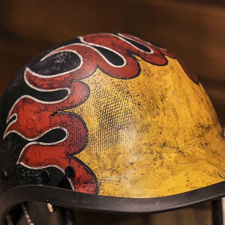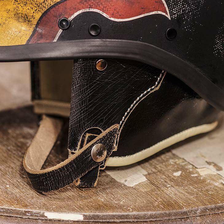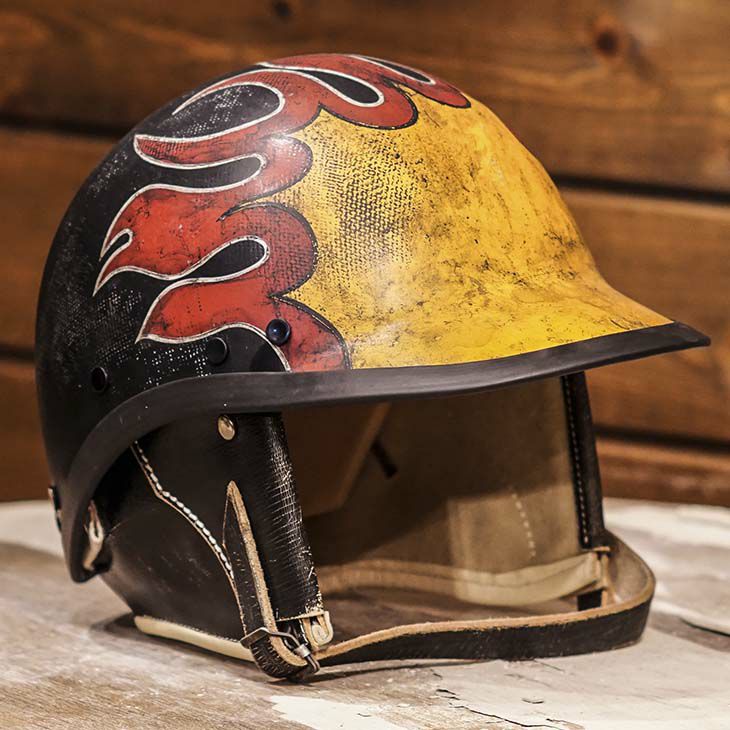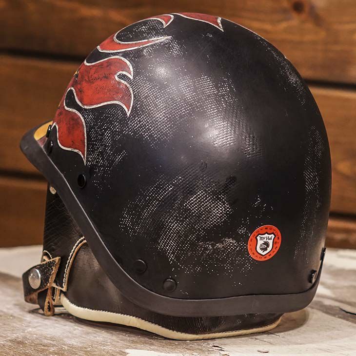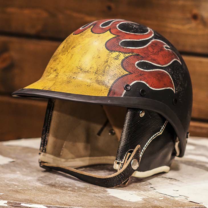 ★☆★☆★☆★☆★☆★☆★☆★☆★☆★☆★☆ 完売いたしました。 ★☆★☆★☆★☆★☆★☆★☆★☆★☆★☆★☆ Fiberglass Exposed ONLY ONE 017 (ファイバーグラス エクスポーズド Hiro パティーナアートスタジオ オンリーワン 017) 当時の塗装が60-70年という長い年月の間に、収縮を繰り返し経年劣化によりファイバーグラスのクロス目が露出する様をリアルに再現しました。 シェルは、Made in Tokyo Line.で復刻した、McHal社のクラブスターを使用しました。 <<サイズ>> S/Mサイズ (55-56cm) L/XLサイズ(57-58cm) このヘルメットは装飾用ヘルメットです。 乗車用(オートバイ用)ヘルメットでは御座いません。 ピンストライプ:JETWRENCH ArtStudio ファイヤーペイント: Hiro Made in Tokyo our Studio.