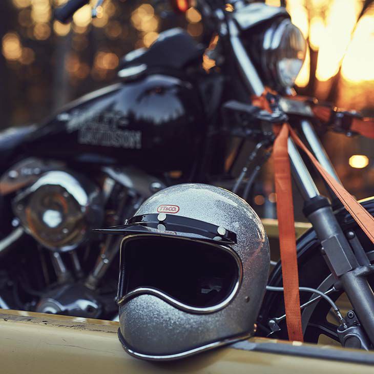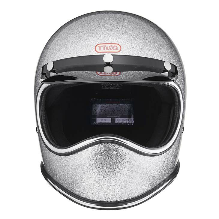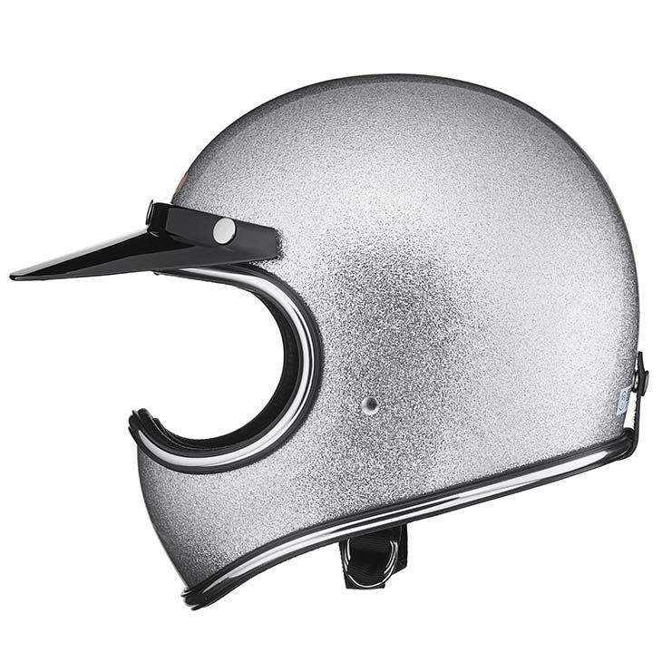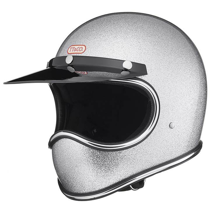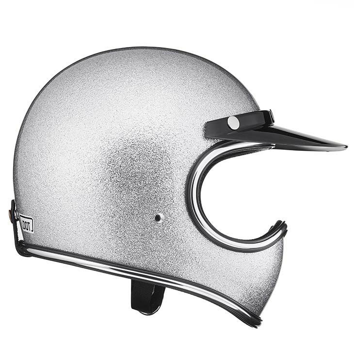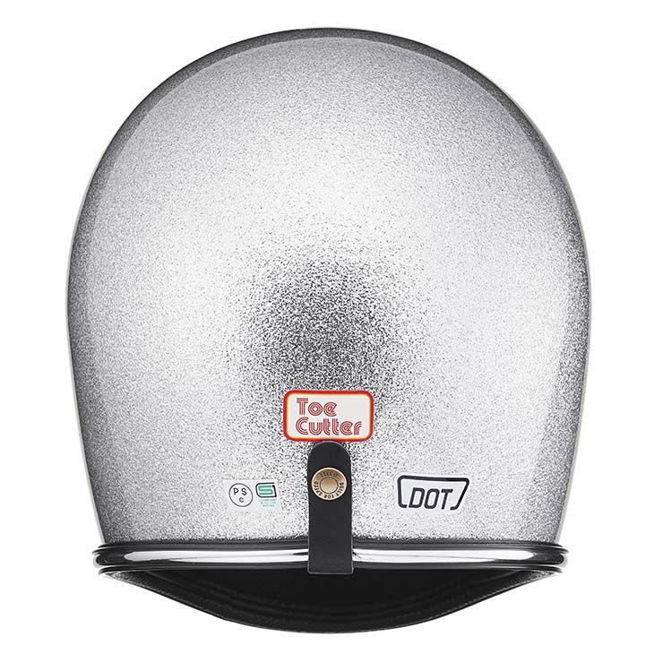【TOECUTTER SG/DOT GINGIRA 70's SILVER】 (トゥーカッター SG/DOT ギンギラセブンティーズ シルバー) 70年代のヴィンテージヘルメットをイメージしたフレーク(ラメ)ヘルメット。 大粒のフレークを下地が見えなくなるまで吹き付けています。 クロームラバートリム仕様。 ヴィンテージヘルメットに使われていた極厚タイプです。 ビンテージスタイルのフルフェイスヘルメット。 3D設計のシェルは乗車用規格で最小サイズのスモールフルフェイスヘルメットです。 日本人の頭に合わせた内装と、重量1.4キログラム以下という軽量化を行い、快適なかぶり心地を実現。 ・標準サイズは、58~59cm (M/Lサイズ、FREEサイズ、相当) ・頭囲53~54cmの方は、 別売りの XSサイズ内装セット ・頭囲55~56cmの方は、 別売りの Sサイズ内装セット ・頭囲56~57cmの方は、 別売りの チークパッドSサイズ、サイズ調整スポンジ ・頬回りがきつい方は、 別売りの チークパッド XLサイズ をお求めください。 ※帽体はSG規格とDOT規格に適合しております。 専用バイザーを付属し、後頭部にはゴーグル留めを装備しました。 画像の色や質感はできる限り実物に近くなるように努めておりますが お使いの環境(モニター、携帯の機種等)により異なる場合がございます。 トゥーカッター専用ゴーグルはラバーモール用に設計しております。 この仕様で使用される場合は隙間やズレなどフィット感に違和感を感じる場合があります。 予めご了承ください。 <トゥーカッター 専用ゴーグル同時購入限定価格> トゥーカッター(革物、グラフィック含む)とトゥーカッター 専用ゴーグル同時購入の場合のみ、9,702円(税込)で販売致します。 このまま13,860円(税込)で購入頂き、受注確認後に弊社にて価格修正を行います。 ・トゥーカッター専用ゴーグルの販売ページ ・TTゴーグルモデルAの販売ページ ・仕様変更専用ダブルストラップの販売ページ ・バブルシールドの販売ページ ・フリップアップシールドの販売ページ ・チークパッドの販売ページ ・サイズ調整スポンジの販売ページ ・Sサイズ内装セットの販売ページ ・XSサイズ内装セットの販売ページ