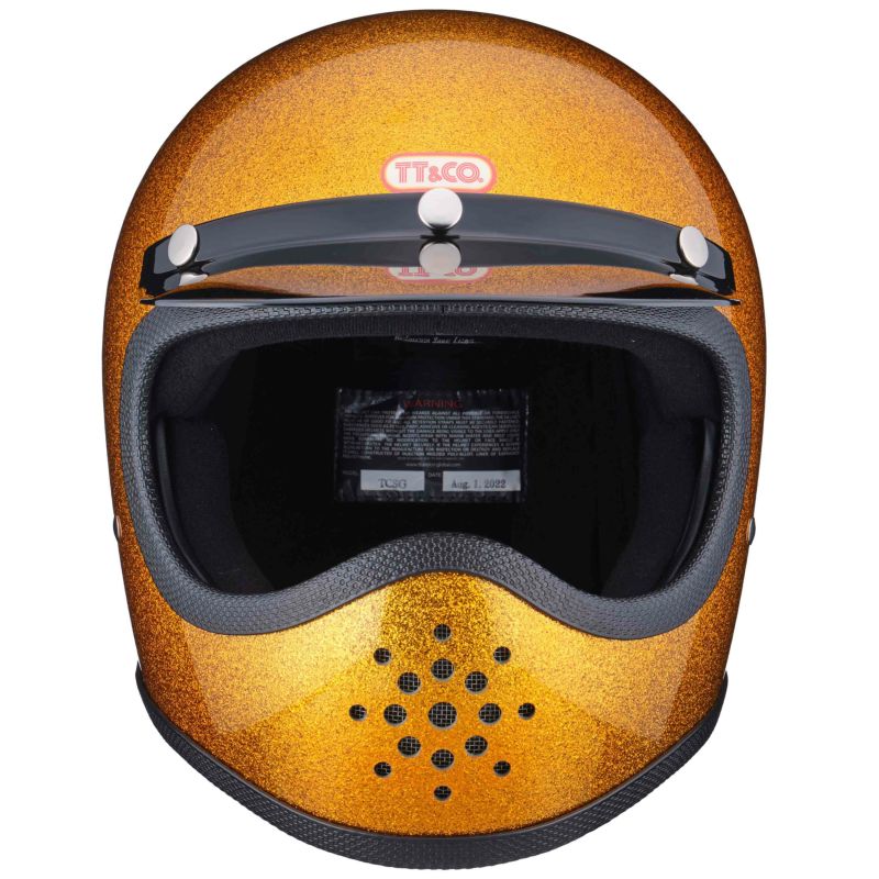【TOECUTTER SG/DOT GINGIRA 70's CUSTOM1 ORANGE】 (トゥーカッター SG/DOT ギンギラセブンティーズ カスタム1 オレンジ) 70年代のヴィンテージヘルメットをイメージしたフレーク(ラメ)ヘルメット。 大粒のフレークを下地が見えなくなるまで吹き付けています。 マウス部分にドリルド加工が施されています。 ビンテージスタイルのフルフェイスヘルメット。 3D設計のシェルは乗車用規格で最小サイズのスモールフルフェイスヘルメットです。 日本人の頭に合わせた内装と、重量1.4キログラム以下という軽量化を行い、快適なかぶり心地を実現。 ・標準サイズは、58~59cm (M/Lサイズ、FREEサイズ、相当) ・頭囲53~54cmの方は、 別売りの XSサイズ内装セット ・頭囲55~56cmの方は、 別売りの Sサイズ内装セット ・頭囲56~57cmの方は、 別売りの チークパッドSサイズ、サイズ調整スポンジ ・頬回りがきつい方は、 別売りの チークパッド XLサイズ をお求めください。 ※帽体はSG規格とDOT規格に適合しております。 専用バイザーを付属し、後頭部にはゴーグル留めを装備しました。 画像の色や質感はできる限り実物に近くなるように努めておりますが お使いの環境(モニター、携帯の機種等)により異なる場合がございます。 蛍光灯,太陽光,電球などの環境下によっては色味の見え方が異なる場合がございます。 蛍光灯など白色の光の場合には、色味が明るくはっきりとした色になり、 暖色系電球などの光の場合には、暗く色が落ち着き、色味が濃く見えます。 トゥーカッター専用ゴーグルはラバーモール用に設計しております。 この仕様で使用される場合は隙間やズレなどフィット感に違和感を感じる場合があります。 予めご了承ください。 <トゥーカッター 専用ゴーグル同時購入限定価格> トゥーカッター(革物、グラフィック含む)とトゥーカッター 専用ゴーグル同時購入の場合のみ、9,702円(税込)で販売致します。 このまま13,860円(税込)で購入頂き、受注確認後に弊社にて価格修正を行います。 ・トゥーカッター専用ゴーグルの販売ページ ・TTゴーグルモデルAの販売ページ ・仕様変更専用ダブルストラップの販売ページ ・バブルシールドの販売ページ ・フリップアップシールドの販売ページ ・チークパッドの販売ページ ・サイズ調整スポンジの販売ページ ・Sサイズ内装セットの販売ページ ・XSサイズ内装セットの販売ページ