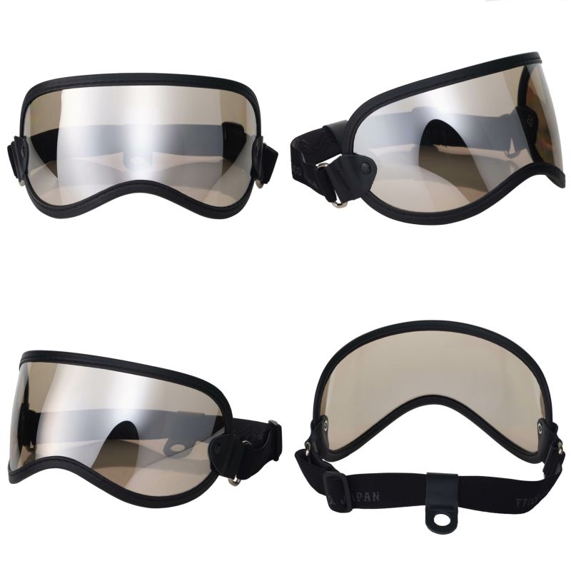 【GOGGLES FOR TOECUTTER SG/DOT】 (ゴーグル トゥーカッター SG/DOT 専用) トゥーカッター SG/DOT専用に設計したゴーグルです。 カラーは、クリア、ライトスモーク、クリアミラーの3色。 (街灯があれば夜間の使用も可能です。) アジャスター式のベルトと後頭部のストラップ留めを装備しました。 レンズには各表面処理行いました。 ・UVカット ・傷がつきにくい、アンチスクラッチ ・くもりを止める、アンチフォッグ ※使用には問題の無い、チリゴミ、タレ、ムラ、キズ、などあります。 ※後頭部のストッパーにベルトを留めていても、ゴーグルを額部にあげたまま走行すると脱落してしまうのでご注意ください。 ※トゥーカッター専用ゴーグルはラバーモール用に設計しております。 ギンギラセブンティーズやレザーリムショットで使用される場合は隙間やズレなどフィット感に違和感を感じる場合があります。 予めご了承ください。 【ベルトの取扱い注意点について】 下記のようにご使用された場合、ベルトが伸びてしまう恐れがございますので ご注意ください。 ・ヘルメットに装着したままなど、テンションをかけ続けて保管 ・屋外や直射日光などの環境下での保管 ・洗濯乾燥機使用時、他の衣類と引っ張り合った場合 ・過度に引っ張った場合 また、通常にご使用されていても経年劣化で伸びてしまう場合もございます。 画像の色や質感はできる限り実物に近くなるように努めておりますが お使いの環境(モニター、携帯の機種等)により異なる場合がございます。