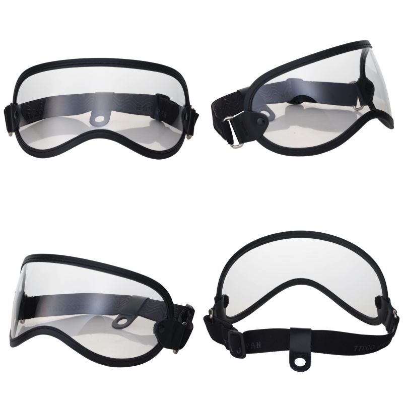 【GOGGLES FOR TOECUTTER SG/DOT】 (ゴーグル トゥーカッター SG/DOT 専用) トゥーカッター SG/DOT専用に設計したゴーグルです。 カラーは、クリア、ライトスモーク、クリアミラーの3色。 (街灯があれば夜間の使用も可能です。) アジャスター式のベルトと後頭部のストラップ留めを装備しました。 レンズには各表面処理行いました。 ・UVカット ・傷がつきにくい、アンチスクラッチ ・くもりを止める、アンチフォッグ ※使用には問題の無い、チリゴミ、タレ、ムラ、キズ、などあります。 ※後頭部のストッパーにベルトを留めていても、ゴーグルを額部にあげたまま走行すると脱落してしまうのでご注意ください。 ※トゥーカッター専用ゴーグルはラバーモール用に設計しております。 ギンギラセブンティーズやレザーリムショットで使用される場合は隙間やズレなどフィット感に違和感を感じる場合があります。 予めご了承ください。 【ベルトの取扱い注意点について】 下記のようにご使用された場合、ベルトが伸びてしまう恐れがございますので ご注意ください。 ・ヘルメットに装着したままなど、テンションをかけ続けて保管 ・屋外や直射日光などの環境下での保管 ・洗濯乾燥機使用時、他の衣類と引っ張り合った場合 ・過度に引っ張った場合 また、通常にご使用されていても経年劣化で伸びてしまう場合もございます。 画像の色や質感はできる限り実物に近くなるように努めておりますが お使いの環境(モニター、携帯の機種等)により異なる場合がございます。