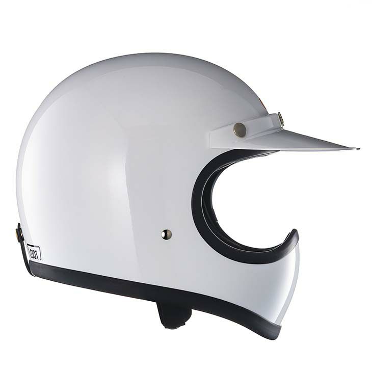 【TOECUTTER SG/DOT STANDARD WHITE】 (トゥーカッター SG/DOT スタンダード ホワイト) ビンテージスタイルのフルフェイスヘルメット。 3D設計のシェルは乗車用規格で最小サイズのスモールフルフェイスヘルメットです。 日本人の頭に合わせた内装と、重量1.2キログラムという軽量化を行い、快適なかぶり心地を実現。 ・標準サイズは、58~59cm (M/Lサイズ、FREEサイズ、相当) ・頭囲53~54cmの方は、 別売りの XSサイズ内装セット ・頭囲55~56cmの方は、 別売りの Sサイズ内装セット ・頭囲56~57cmの方は、 別売りの チークパッドSサイズ、サイズ調整スポンジ ・頬回りがきつい方は、 別売りの チークパッド XLサイズ をお求めください。 ※帽体はSG規格とDOT規格に適合しております。 同色の専用バイザーを付属し、後頭部にはゴーグル留めを装備しました。 (シルバーメタリックはブラックバイザーを付属) 専用バイザーとシェルのカラーは完全には一致しておりません。 画像の色や質感はできる限り実物に近くなるように努めておりますが お使いの環境(モニター、携帯の機種等)により異なる場合がございます。