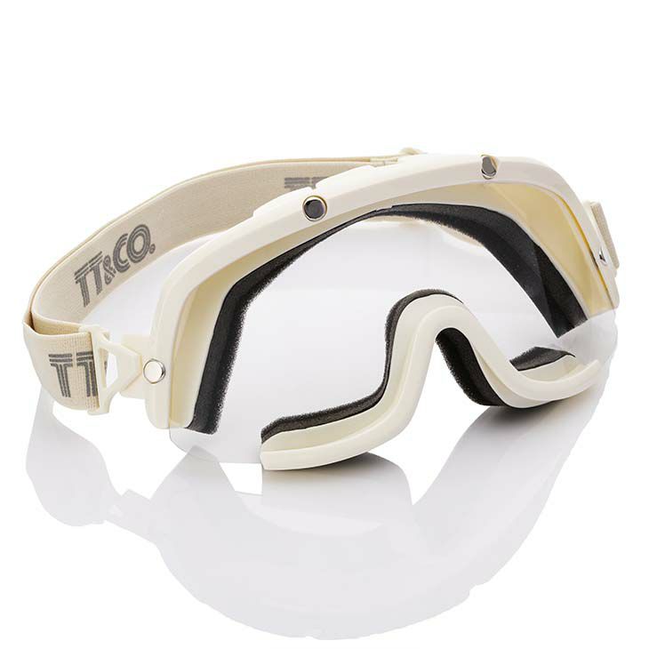 【TT GOGGLES MODEL A IVORY】 (TTゴーグル モデルA アイボリー) ヴィンテージゴーグルをサンプリングし、細部にまで拘って完成したゴーグルとなっています。 クリアレンズのみ付属 レンズには ・UVカット ・傷がつきにくい、アンチスクラッチ 各表面処理が施されています。 使用には問題の無い、チリゴミ、タレ、ムラ、キズ、などあります。 ベルトのロゴは光を反射するリフレクター機能付。 レンズ / ベルト / ノーズパッドには 各カラーバリエーションをご用意しておりますので、 お好みでカラーコディネートしていただけます。 別途お求め下さい。 2023年2月9日以前に販売していた製品より一部仕様変更あり 部品の互換性がございませんので、ご注意ください。 【ベルトの取扱い注意点について】 下記のようにご使用された場合、ベルトが伸びてしまう恐れがございますので ご注意ください。 ・ヘルメットに装着したままなど、テンションをかけ続けて保管 ・屋外や直射日光などの環境下での保管 ・洗濯乾燥機使用時、他の衣類と引っ張り合った場合 ・過度に引っ張った場合 また、通常にご使用されていても経年劣化で伸びてしまう場合もございます。 画像の色や質感はできる限り実物に近くなるように努めておりますが お使いの環境(モニター、携帯の機種等)により異なる場合がございます。 レンズ交換方法はこちら