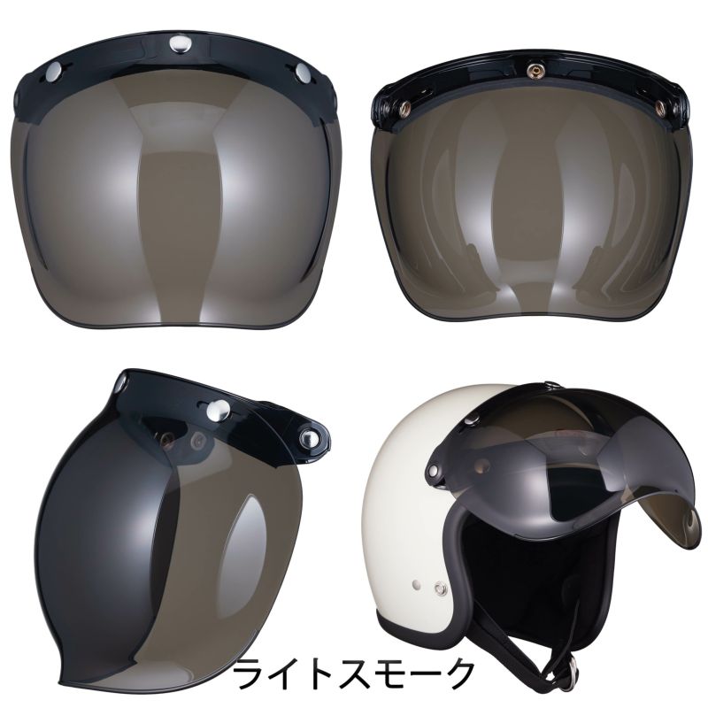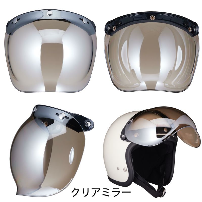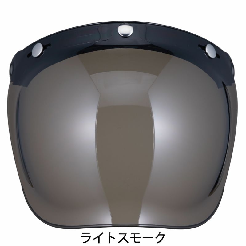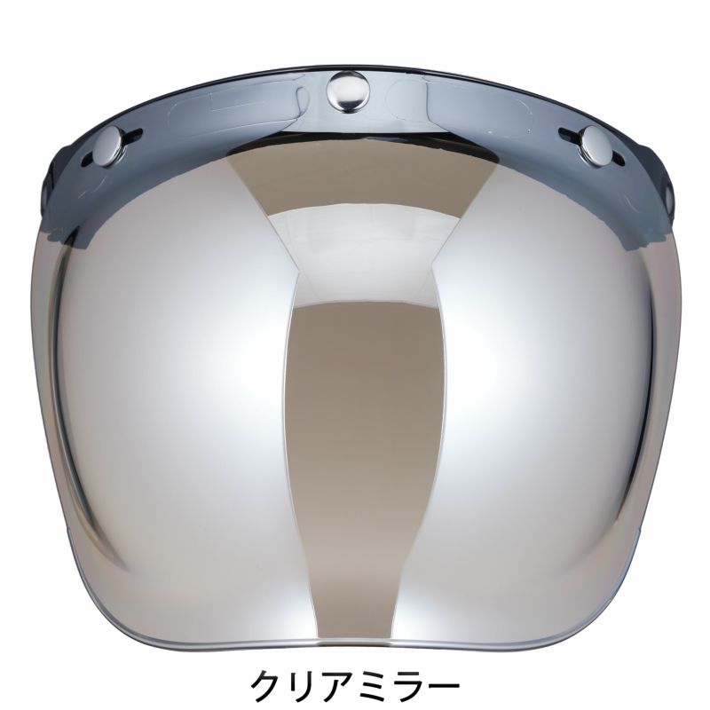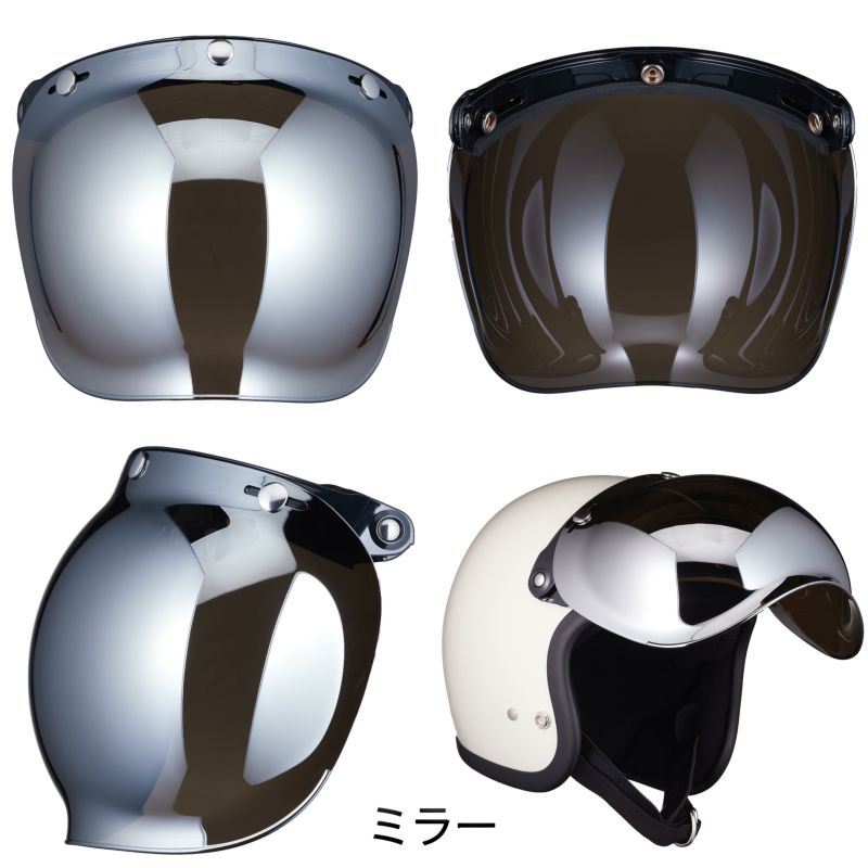 【BUBBLE SHIELD】 (バブルシールド) 昔ながらの球体デザインですが、ひずみは少なく視界性はとても良いです。 カラーは、クリア、ライトスモーク、クリアミラー、ミラーの4色。 レンズは ・UVカット ・傷つきにくいアンチスクラッチ の各表面処理済み。 左右のスナップボタンはアジャスター機能があるので、一般的なSG規格のジェットヘルメットに取付け可能です。 ただし、弊社ヘルメット以外に取り付ける場合、スナップの相性により外れやすい場合がございます。 開閉を可能にする、フリップアップベース付になります。 街灯があれば夜間の使用も可能です。 ※ミラーのみ夜間の使用は不可となります。 レザーリムショット、ヴィンテージレザートリム、シリアスVL、シリアスRS、への取り付けは不可となります。 当社500TXへの装着も可能ですが、帽体に比べ大きめな見た目になります。 取付け用のスナップボタンは、安全上とてもかたい仕様になっています。 3点ともしっかりと取付け下さい。 しっかり取付け出来ていても、後方確認時など、突然の風の巻き込みにより、脱落してしまうことがあります。 ヘルメットから取り外す際は、マイナスドライバーなどを使い、接合部分をこじる様にして取り外してください。 引っ張って外すと、スナップボタンが破損することがあります。 ラチェット式ベースを採用 シールドを最上部まで開ける場合や取り付けの際に力を入れすぎますと ベースがヘルメット本体に干渉し、傷つけてしまう恐れがございます。 お取り扱いにはご注意ください。 画像の色や質感はできる限り実物に近くなるように努めておりますが お使いの環境(モニター、携帯の機種等)により異なる場合がございます。