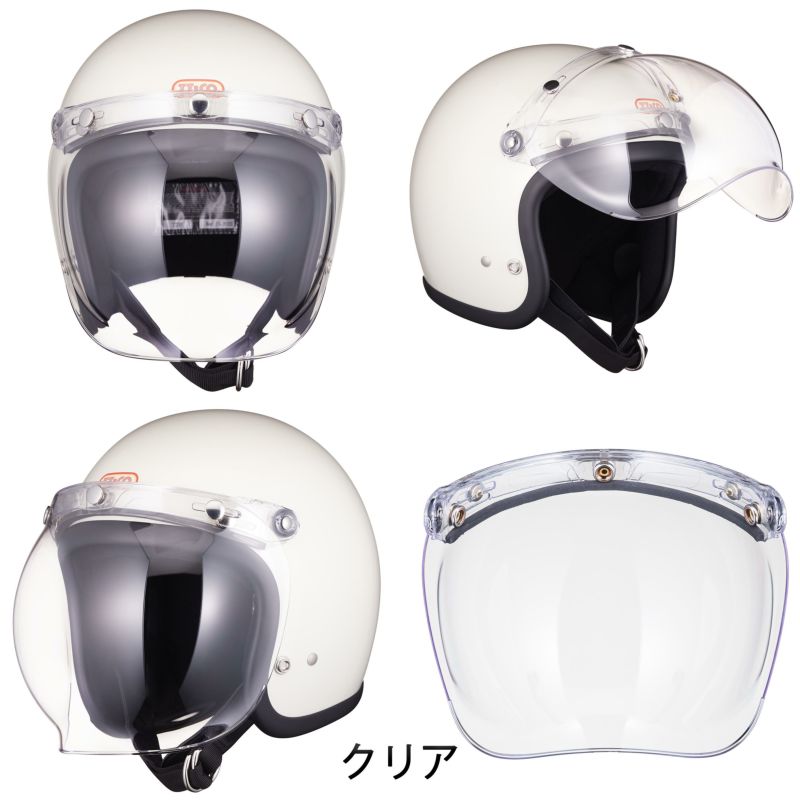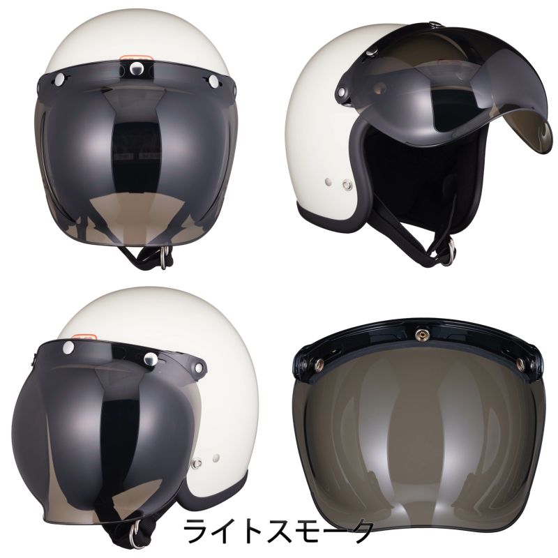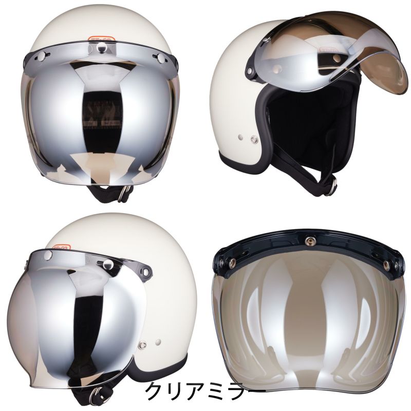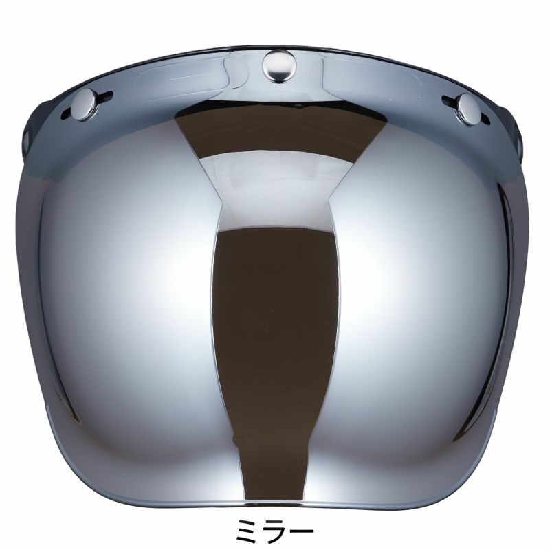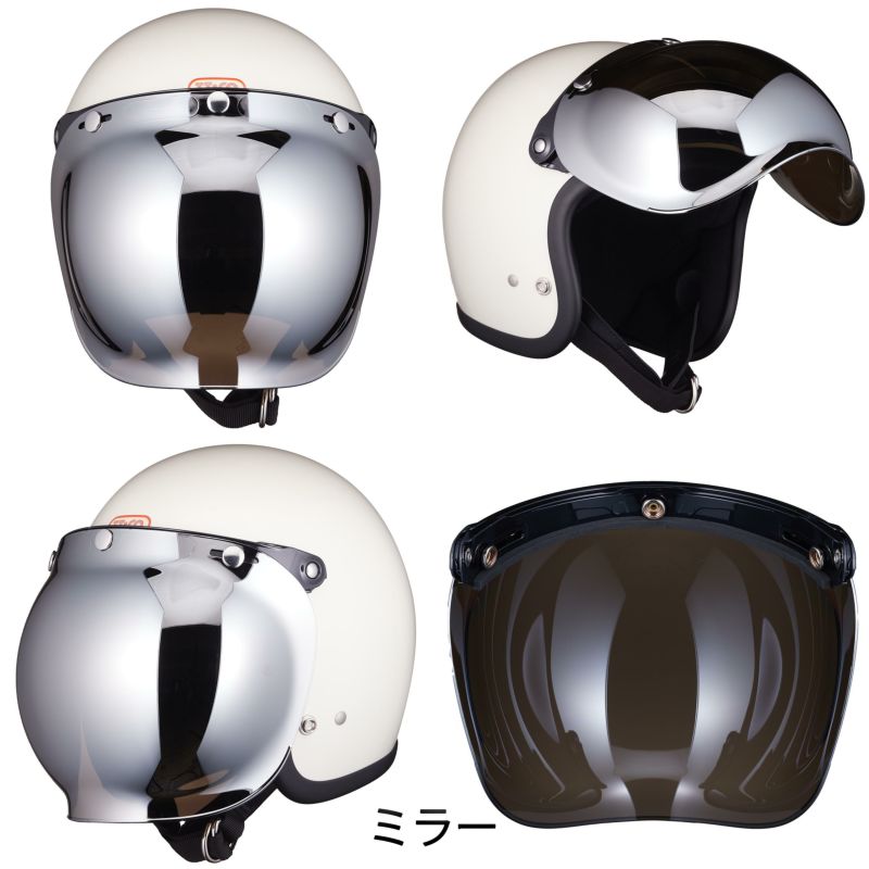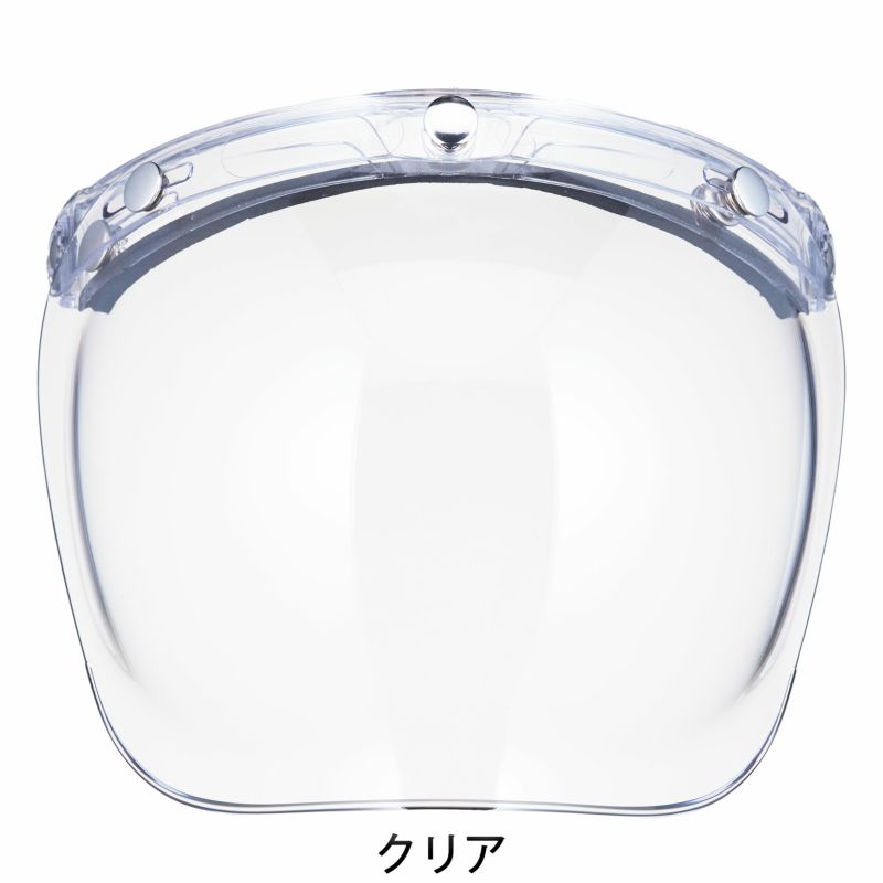 【BUBBLE SHIELD】 (バブルシールド) 昔ながらの球体デザインですが、ひずみは少なく視界性はとても良いです。 カラーは、クリア、ライトスモーク、クリアミラー、ミラーの4色。 レンズは ・UVカット ・傷つきにくいアンチスクラッチ の各表面処理済み。 左右のスナップボタンはアジャスター機能があるので、一般的なSG規格のジェットヘルメットに取付け可能です。 ただし、弊社ヘルメット以外に取り付ける場合、スナップの相性により外れやすい場合がございます。 開閉を可能にする、フリップアップベース付になります。 街灯があれば夜間の使用も可能です。 ※ミラーのみ夜間の使用は不可となります。 レザーリムショット、ヴィンテージレザートリム、シリアスVL、シリアスRS、への取り付けは不可となります。 当社500TXへの装着も可能ですが、帽体に比べ大きめな見た目になります。 取付け用のスナップボタンは、安全上とてもかたい仕様になっています。 3点ともしっかりと取付け下さい。 しっかり取付け出来ていても、後方確認時など、突然の風の巻き込みにより、脱落してしまうことがあります。 ヘルメットから取り外す際は、マイナスドライバーなどを使い、接合部分をこじる様にして取り外してください。 引っ張って外すと、スナップボタンが破損することがあります。 ラチェット式ベースを採用 シールドを最上部まで開ける場合や取り付けの際に力を入れすぎますと ベースがヘルメット本体に干渉し、傷つけてしまう恐れがございます。 お取り扱いにはご注意ください。 画像の色や質感はできる限り実物に近くなるように努めておりますが お使いの環境(モニター、携帯の機種等)により異なる場合がございます。